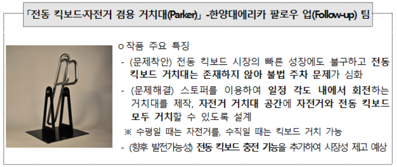 「캡스톤디자인·팀프로젝트 경진대회」는 산업체(사회)의 문제를 해결하기 위해 학생들이 창의성과 협동심을 발휘하여 종합 기획·설계·제작한 작품 221점*이 출품되었다. 그중 작품의 완성도, 창의성 및 우수성, 제품화 가능성 등을 종합하여 높은 평가를 받은 35개* 작품이 수상하였다. ‘팔로우 업(Follow-up)’팀(한양대에리카)은 전동 킥보드의 불법 주차 문제를 해결하기 위해 전동 킥보드 및 자전거 겸용 거치대 ‘파커(Parker)’를 제작·특허 출원하여 높은 점수를 받았다.