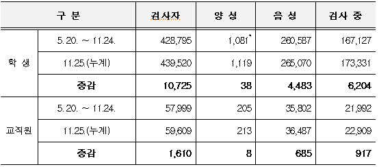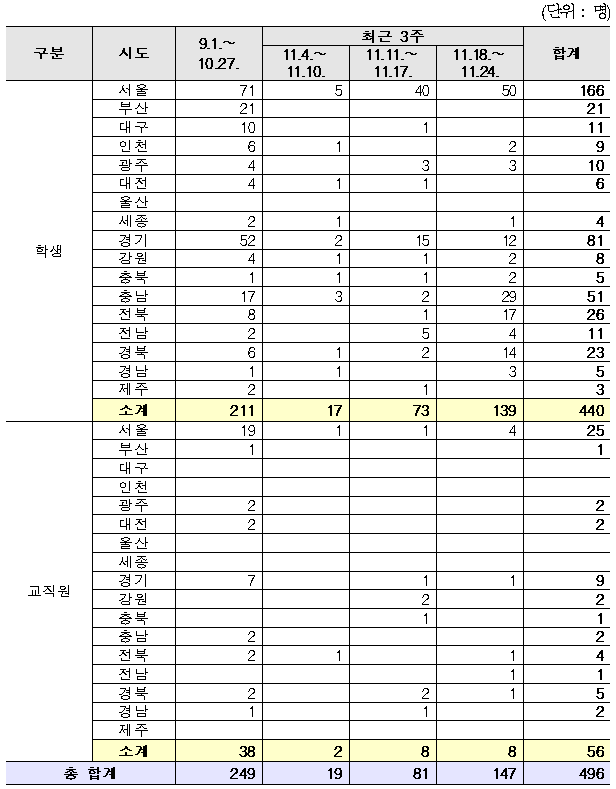 - 11.18.부터 11.24.까지 학생 139명, 교직원 8명 증가