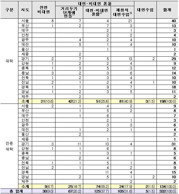 □ 대학 수업운영 방식 현황(11.23.자 기준, 단위 : 개교(비율(%)))