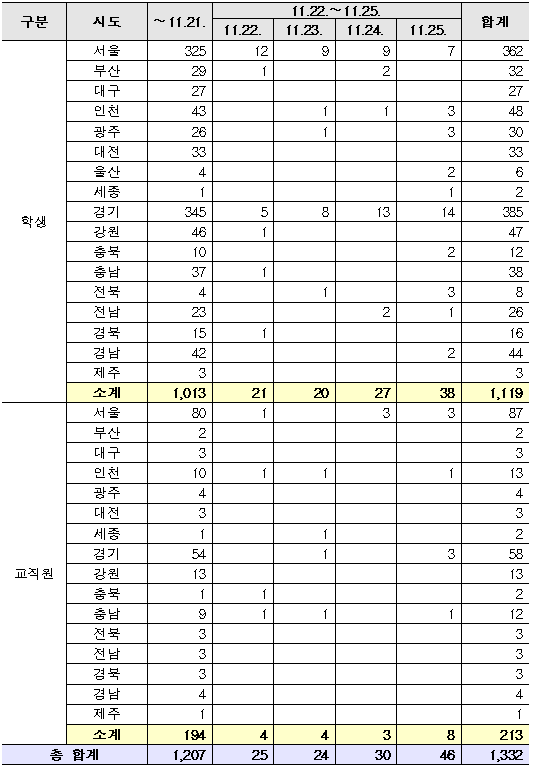 - 등교 이후 확진자 누계 11.25.(수) 00시 대비 학생 48명, 교직원 8명 증가 【누계 1,332명(학생 1,119명, 교직원 213명)】