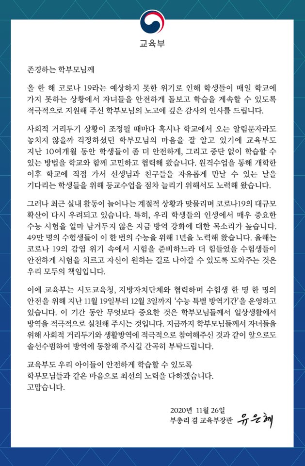 | 수능 시행 일주일 전 대국민 호소문 (0) | 2020.11.26 |