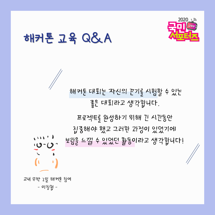 하나의 프로젝트를 친구들과 함께 마무리하는 것이 정말 뜻 깊게 남는 것 같습니다! 인터뷰를 통해 해커톤이 4차산업혁명시대에 학생들에게 필요한 역량은 물론이고 협업과 소통능력까지 배울 수 있는 좋은 교육 환경이 될 수 있을 것이라 생각됩니다.