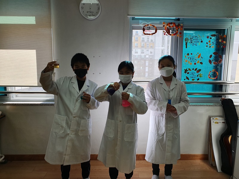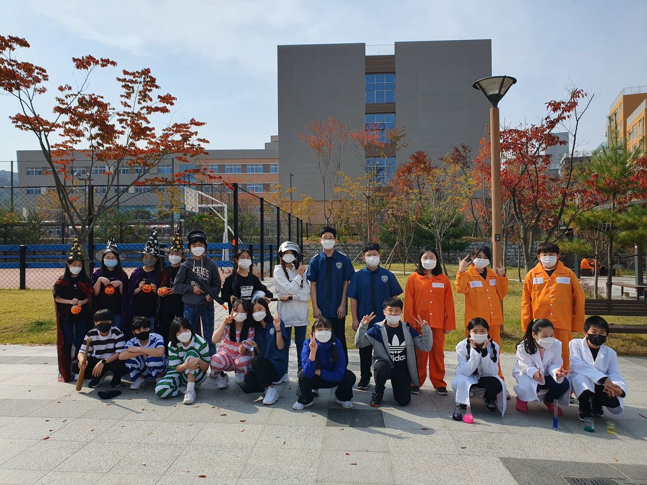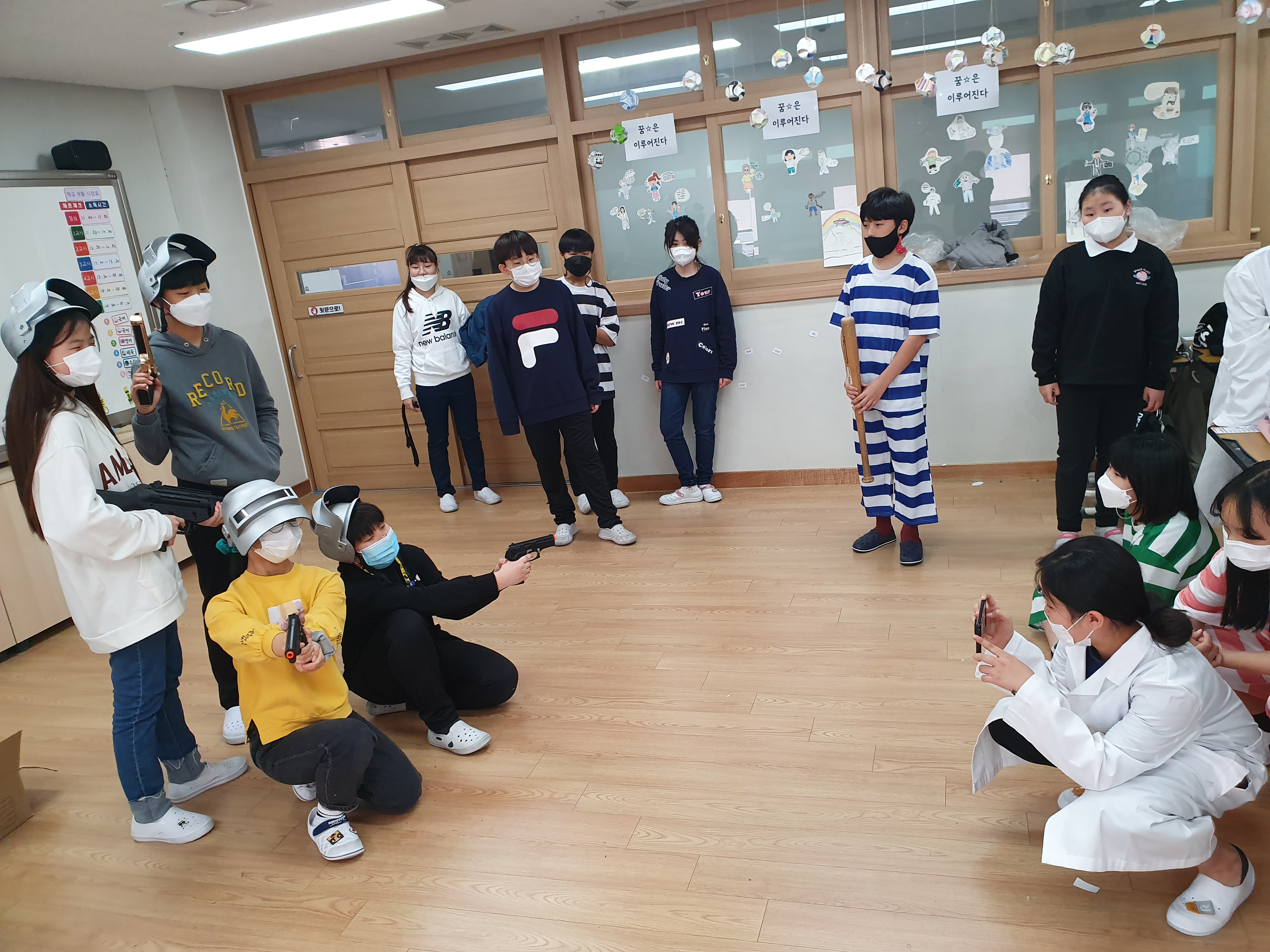 모둠별로 활발하게 토의를 통해 컨셉을 정하고, 이를 바탕으로 필요한 물품을 학생들이 종이에 적어 제출하면 이를 반영하여 물품을 제공해 주었습니다. 컨셉이 경찰, 죄수, 과학자, 할로윈, 특공대 등으로 다양한 만큼 물품의 종류도 다양했습니다. 물품이 오면 직접 소품을 착용하거나 제작해서 함께 포즈를 정해보는 시간을 가졌습니다. 한 가지 포즈가 아닌 최소 3가지 이상의 포즈를 연습하여 실제 촬영할 때 다양한 포즈를 취해보고, 가장 잘 나온 사진을 졸업앨범에 넣자고 협의했습니다. 또한 모둠별로 서로 실제 야외에서 찍을 상황을 가정하여 연습을 여러 번 하였고, 이를 다른 모둠 친구들이 서로 사진을 직접 찍어주었으며, 더 나은 사진을 위해 서로 조언해주는 시간을 가졌습니다.