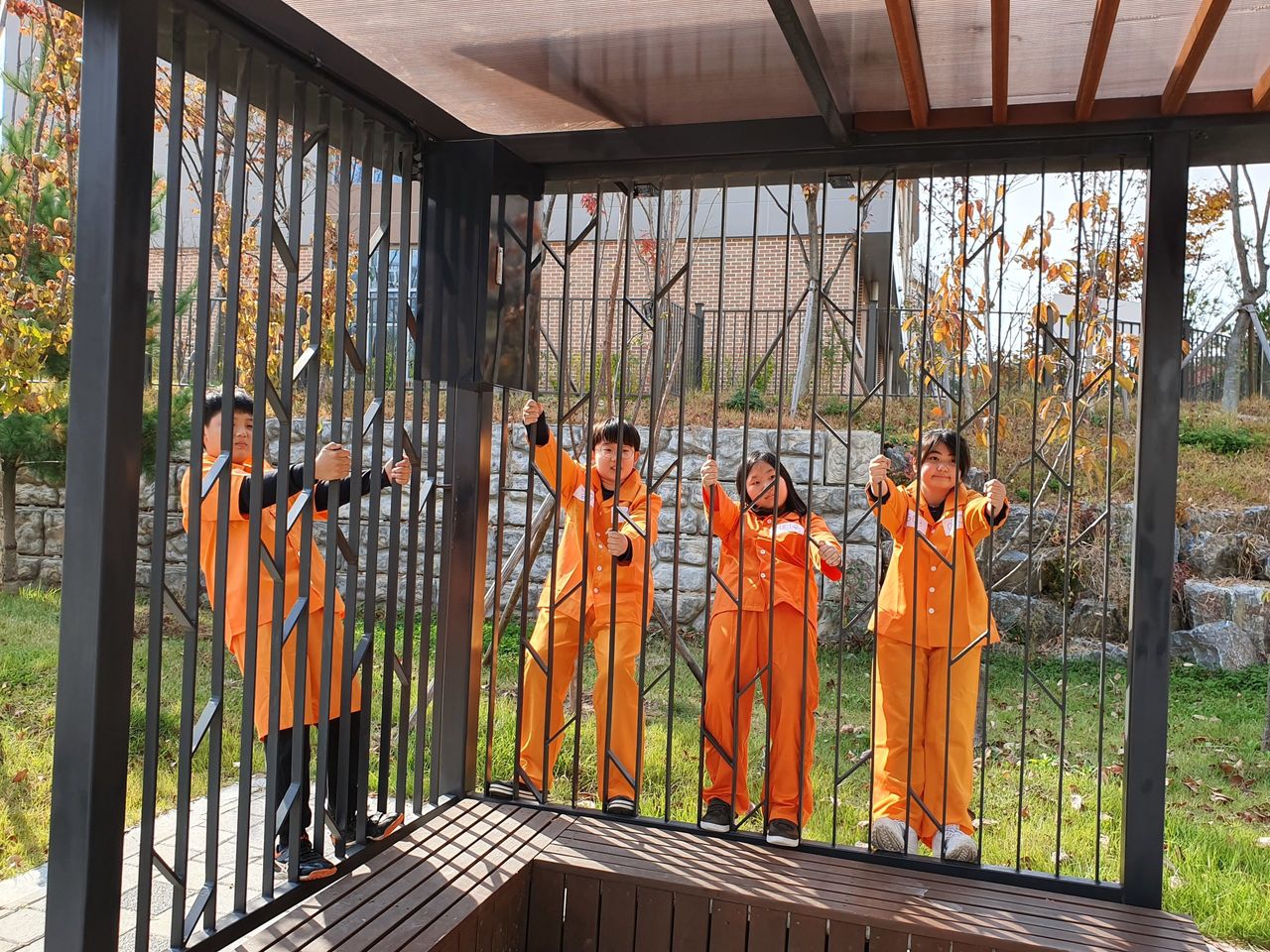 드디어 실전! 떨리기도 하고 설레기도 한 그날이 빨리 다가왔습니다. 우리는 의상을 입은 채 주위 사람들의 시선을 사로잡으며, 학교 근처의 촬영장소로 향했습니다. 각 모둠별로 컨셉에 맞게 야외 장소에 가서 포즈를 취했고, 사진 작가님께서 돌아다니면서 여러 컷 사진을 찍어주셨습니다. 죄수 컨셉은 마치 감옥느낌이 나도록 벤치에 있는 기둥 뒤에 매달려 찍었고, 경찰 컨셉은 우리는 언제든 달려 갈 준비가 되어있다는 느낌으로 찍었습니다. 이때, 슬기로운 사진생활을 위해 사진을 찍을 때만 마스크를 벗고, 마스크를 벗을 땐 이야기하지 않고 포즈만 취하고 있었습니다.