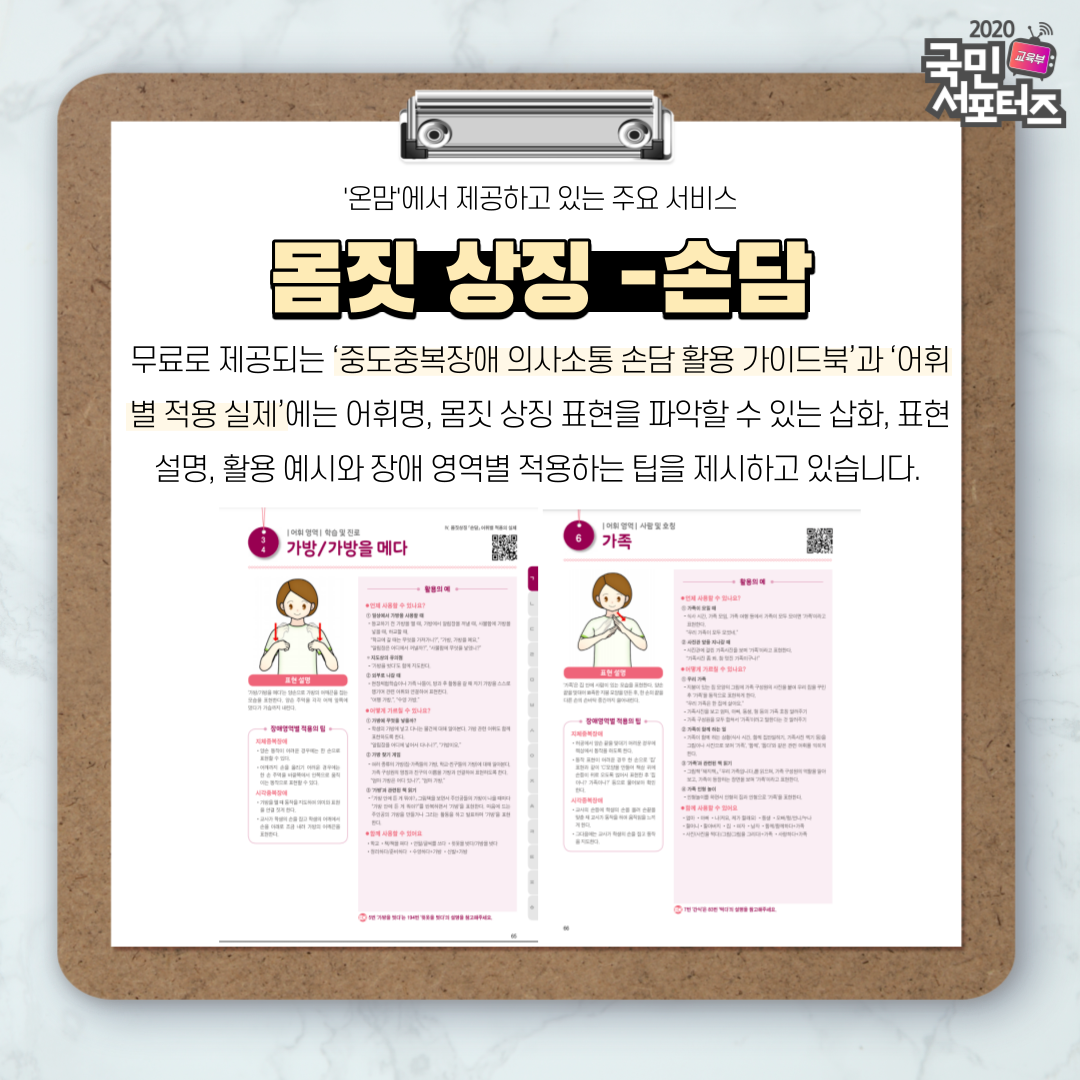 이 외에도 몸짓 상징 손담 자료 게시판에 들어가면, 무료로 ‘중도중복장애 의사소통 손담 활용 가이드북’과 ‘어휘별 적용 실제’ 학습 자료집이 제공되고 있습니다. 본 학습 자료에서도 어휘 명을 제시하고, 몸짓 상징 표현을 핵심적으로 파악할 수 있도록 삽화, 표현 설명, 활용 예시와 장애 영역별 적용하는 팁을 쉽게 이해하여 실생활에 사용할 수 있도록 제시하고 있습니다.