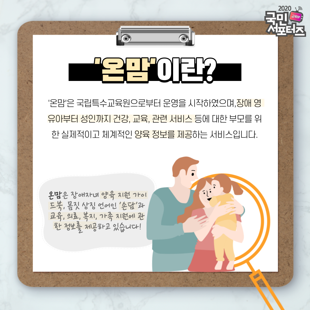 장애자녀 부모지원종합시스템인 ‘온맘’은 2019년 상반기에 교육부 산하기관인 국립특수교육원으로부터 운영을 시작하였으며, 장애 영유아부터 성인까지 건강, 교육, 관련 서비스 등에 대한 부모를 위한 실제적이고 체계적인 양육 정보를 제공하는 서비스입니다. 여기서 ‘온맘’을 관리하고 구축하는 국립특수교육원은 생애 단계별 맞춤형 특수교육을 적극적으로 지원하고 장애학생 관련 연구 및 사업을 추진하며, 장애학생들의 성공적인 사회통합 실현을 중점에 두고 있는 것이 주요 목적입니다. 따라서 현재 ‘온맘’의 주요 서비스는 장애 자녀 양육 지원가이드북 자료와 몸짓 상징 언어인 ‘손담’을 제공하고 있습니다. 이 밖에도 교육, 의료, 복지, 가족 지원에 관한 정보를 한곳에 모아 계속적으로 업데이트를 하고 있습니다.