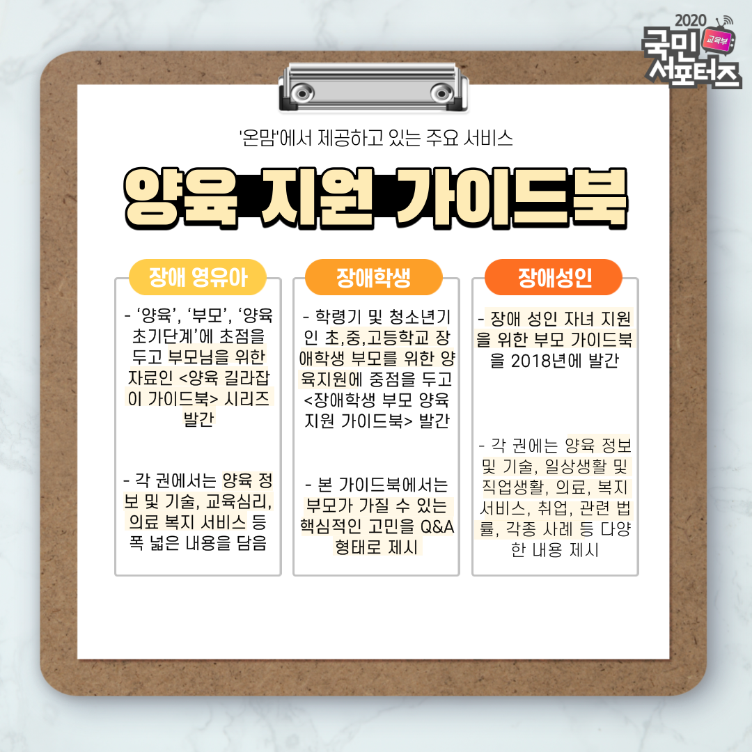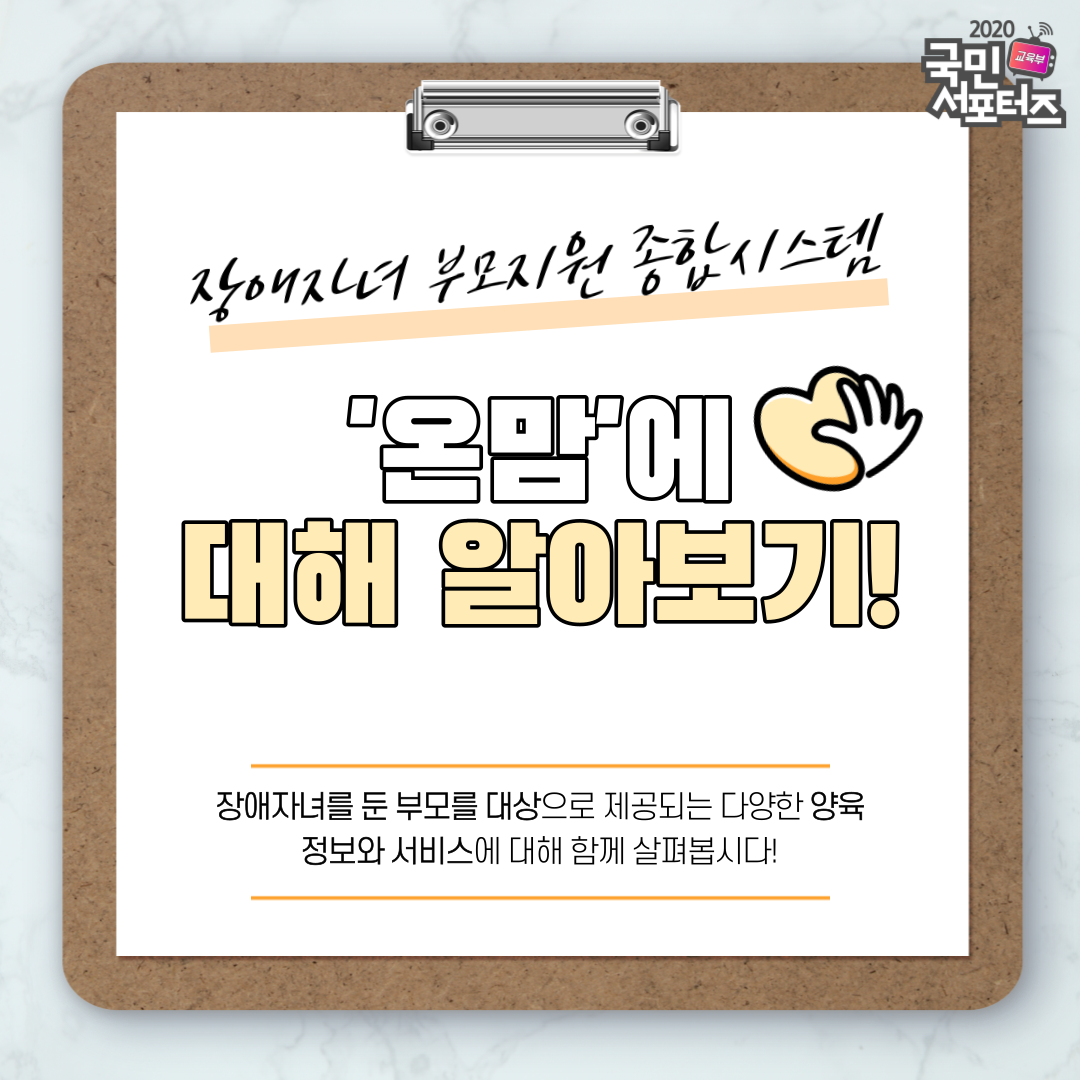 아마 여러분들도 장애 학생을 위한 취업, 발달 재활, 교육, 보호 등 지원 서비스를 각 공공기관이나 학교에서 제공하고 있다는 걸 잘 아실 것이라고 믿습니다. 그래서 오늘은 조금 더 특별하게 장애학생이 아닌 장애자녀를 둔 부모를 대상으로 상세하고 풍부한 양육 정보를 제공하는 장애자녀 부모지원 종합시스템 ‘온맘’에 대해 소개해드리려고 합니다.