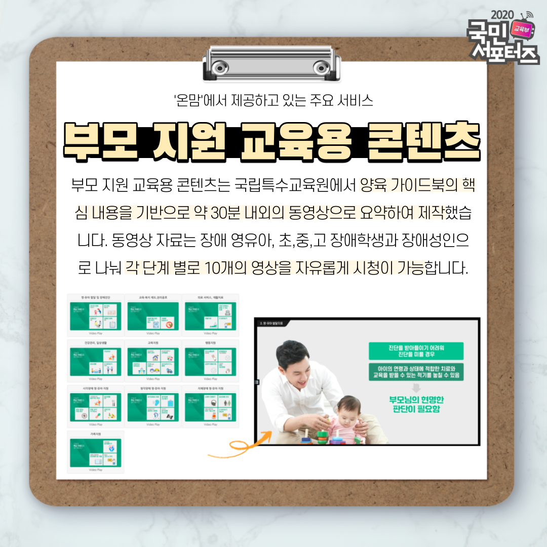 ‘온맘’에서 제공하는 두 번째 서비스는 부모 지원 교육용 콘텐츠입니다. 국립특수교육원에서는 양육 가이드북의 핵심 내용을 약 30분 내외의 동영상으로 요약하여 제작했습니다. 동영상 자료 역시 장애 영유아, 초, 중, 고 장애학생과 장애성인으로 나눠 각 단계별로 10개의 영상을 자유롭게 시청이 가능합니다. 또한, 동영상 속 모든 내용은 짧고 간략하게 요약되어 있으므로 쉽게 내용을 파악할 수 있을 뿐만 아니라 오디오 자료까지 함께 재생되어 짧은 시간 안에 장애학생 부모를 위한 양육 지원 가이드북 내용을 이해할 수 있습니다. 특히 동영상 끝날 무렵에는 오늘 강의에서 배운 내용을 다시 한번 정리해 주며, 다음 강의에서는 어떤 내용을 배울 것인지 미리 설명해주어 학습하는데 용이합니다.