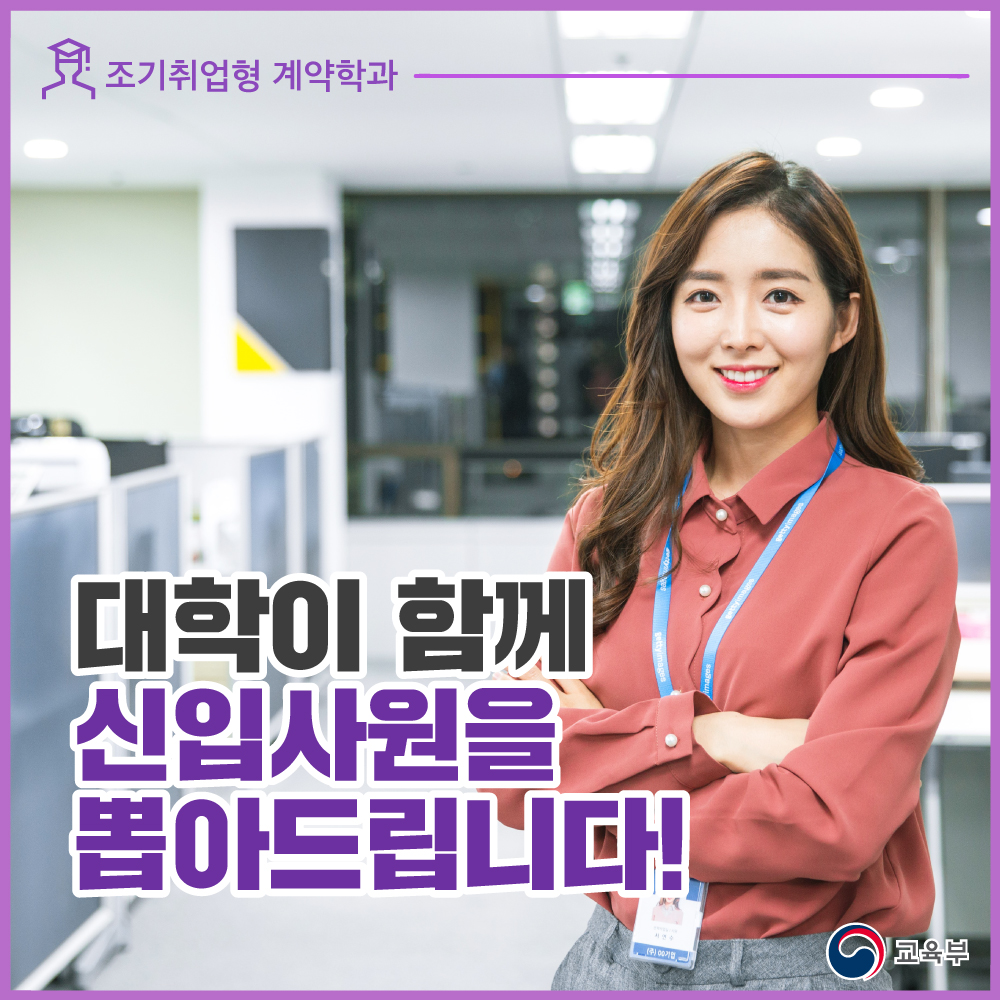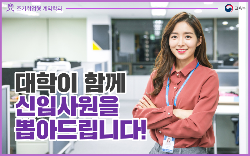 ‘신입사원 채용’에서 가장 중요한 건 ‘성장 가능성’입니다. 하지만 ‘성장 가능성’, 채용 과정에서 어떻게 확인할 수 있을까요? ‘성장 가능성’을 확인할 수 있는 전문가와 함께 채용을 진행하고 싶다면 ‘조기취업형 계약학과’를 통해 ‘신입사원’을 채용해보세요! ‘조기취업형 계약학과’라면 교육 전문가인 ‘대학’이 ‘기업’의 신입사원 채용에 함께합니다!