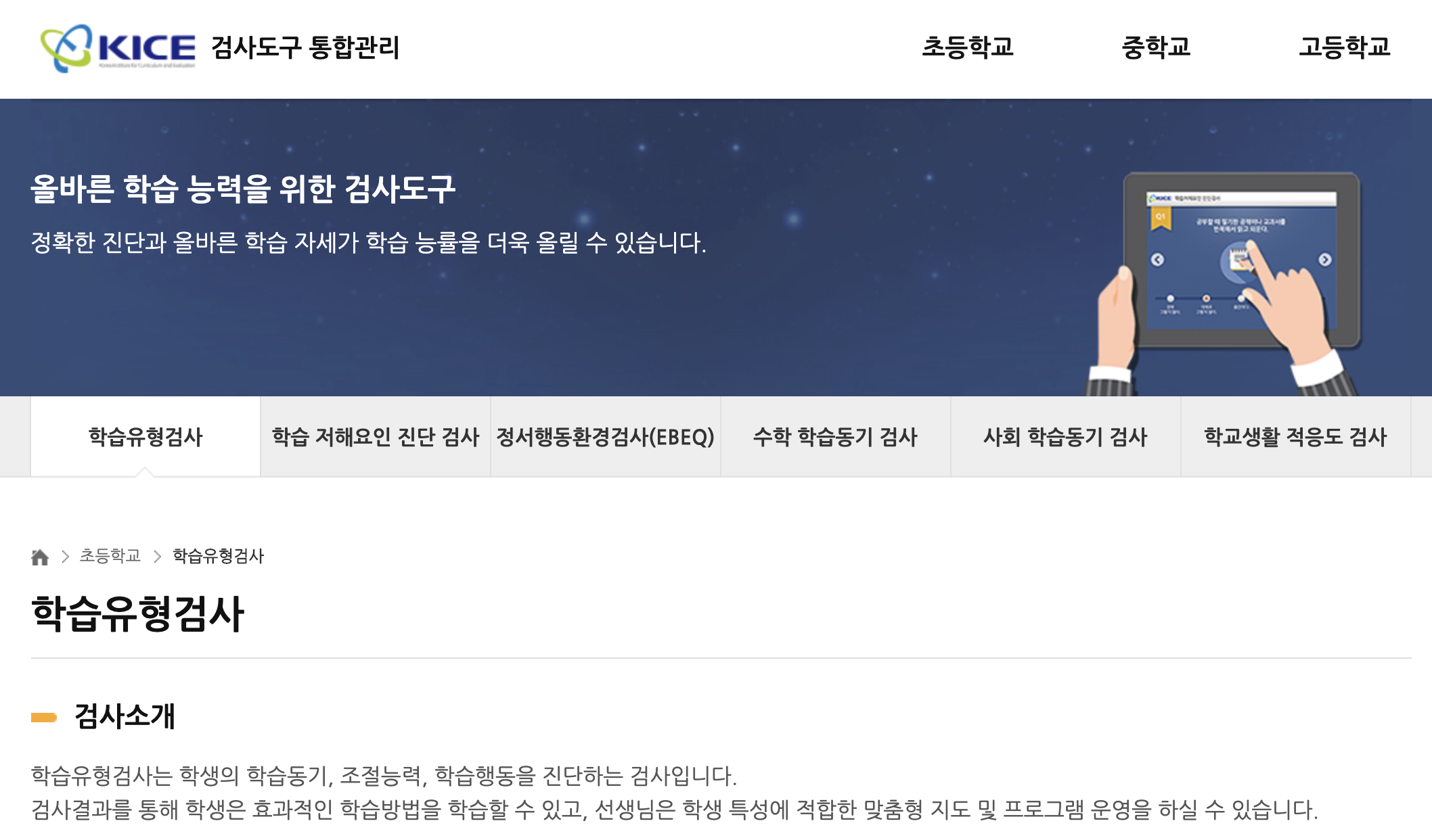 먼저 검사 도구에서는 초등학교, 중학교, 고등학교 학교급을 대상으로 학습부진 원인 및 학생의 학습유형을 파악하는 표준화된 심리검사 도구를 제공하고 있습니다. 초등학교에서는 학습유형 검사, 학습 저해 요인 진단 검사, 정서행동환경 검사, 수학 학습동기 검사, 사회 학습동기 검사, 학교생활 적응도 검사를 실시할 수 있습니다. 중학교에서는 학습유형 검사와 정서행동환경 검사를 실시할 수 있습니다. 고등학교에서는 자기조절학습 검사를 실시할 수 있습니다. 기초학력에 어려움이 나타나는 조기에 지원이 이루어질 수 있도록 초등학교에서 활용할 수 있는 검사 도구가 비교적 다양함을 알 수 있습니다. 또한 검사 도구마다 결과지와 학생지도 지침 등을 제공하고 있기 때문에 학생 지도에 많은 도움이 됩니다. 다음으로 교과학습은 어떻게 구성되어 있는지 알아보겠습니다.