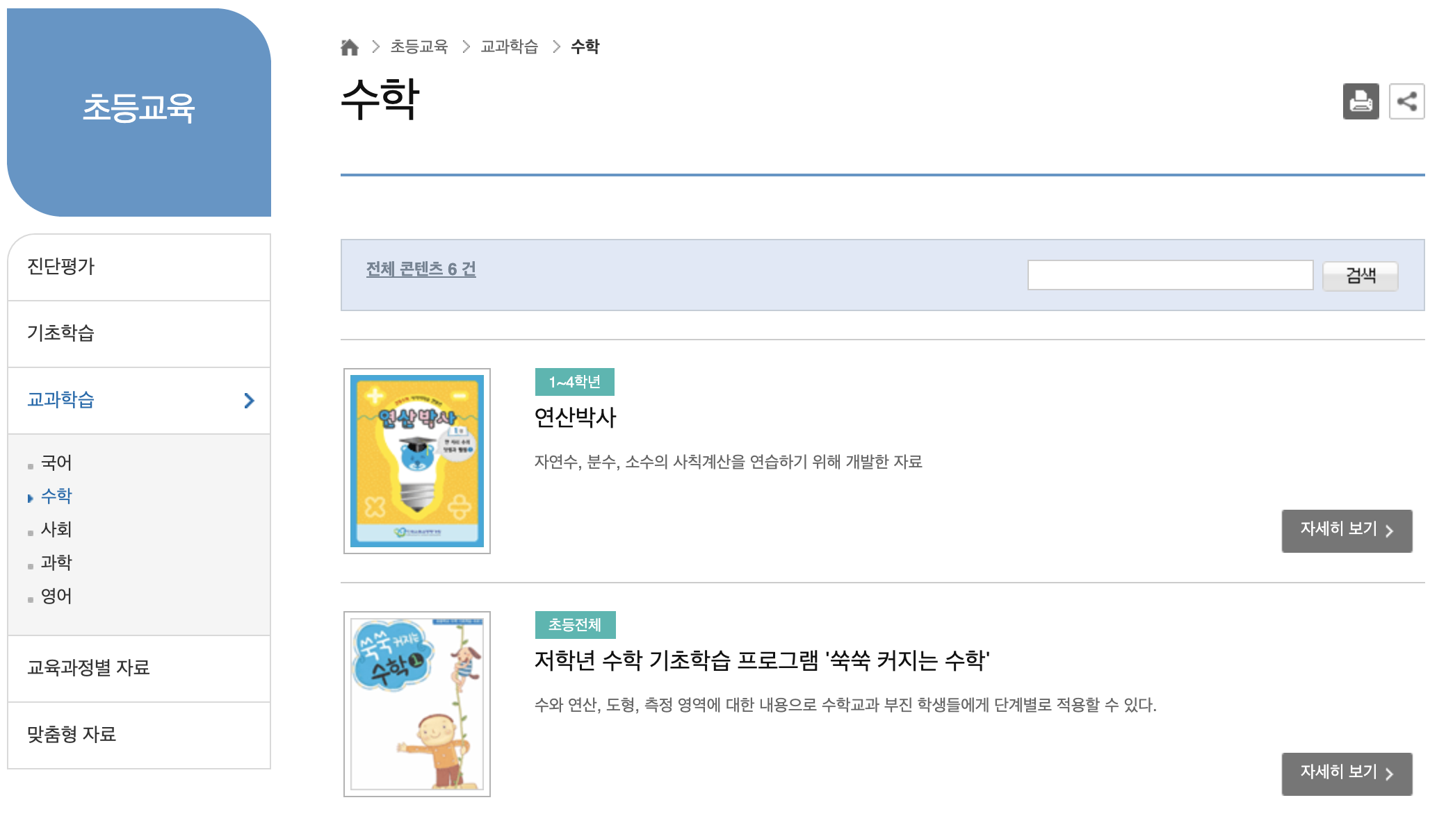 초등교육, 중등교육 모두 국어, 수학, 사회, 과학, 영어 5개 교과에 대한 학습 자료를 제공하고 있습니다. 학습자들에게 발생할 수 있는 어려움을 예방하는 동시에, 이미 발생한 어려움을 보완하여 정상적인 해당 학년의 교과학습을 통해 교육목표를 달성할 수 있도록 구성되어 있습니다. ‘꾹꾹 다지는 국어’, ‘쑥쑥 커지는 수학’ 등의 학습자료는 하나의 공통점을 가지고 있습니다. 바로 ‘학생의 자기 주도적 학습이 가능하도록 구성하여 교사의 추가적인 지도나 노력 없이 활용할 수 있습니다.’입니다. 문제 형식으로 내용을 구성하여 교사의 도움 없이 학생 스스로 학습할 수 있지만 교사나 학부모를 위한 안내 자료로 지도·학습상의 유의점 등에 대해서도 별도 제공되어 있습니다.