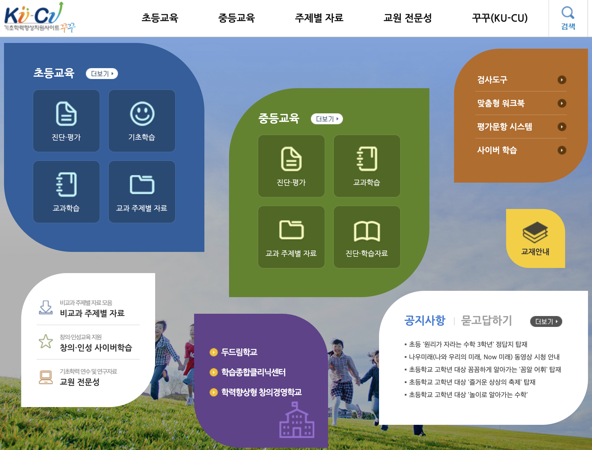 홈페이지를 통해 초등교육, 중등교육에 대한 진단 및 평가, 다양한 학습자료를 쉽게 찾아볼 수 있습니다. 교원 및 학부모에게 있어 쉽게 활용할 수 있는 장점이 있으며 이외에도 비교과 주제별 자료 및 기초학력 정책과 관련하여 다양한 자료를 찾을 수 있습니다. 다음으로 꾸꾸(KU-CU)에서 제공하고 있는 자료를 알아보겠습니다.