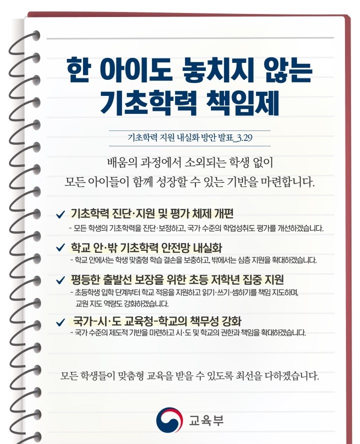 배움의 과정에서 모든 학생은 성공적인 학습 목표 달성을 위해 노력하고 있습니다. 하지만 소외되는 학생이 발생할 수 있기 마련인데요. 2019년 교육부는 배움의 과정에서 소외되는 학생 없이 모든 아이들이 함께 성장할 수 있는 기반을 마련하고자 ‘기초학력 책임제’를 발표했습니다. 기초학력 책임제에 대한 자세한 내용은 교육부에서 확인할 수 있습니다.