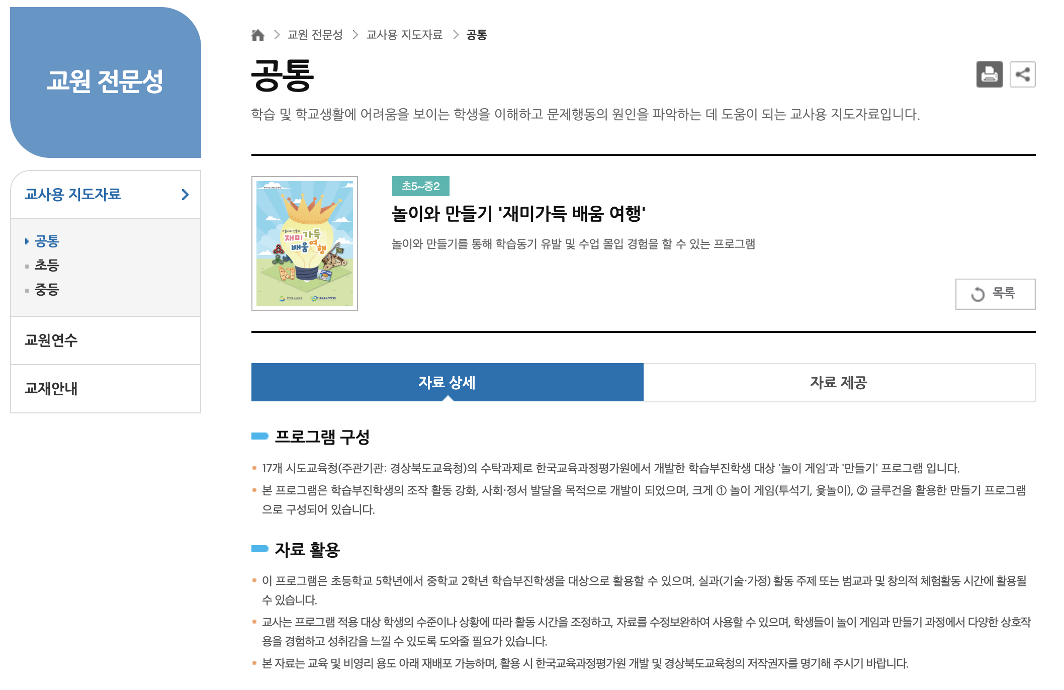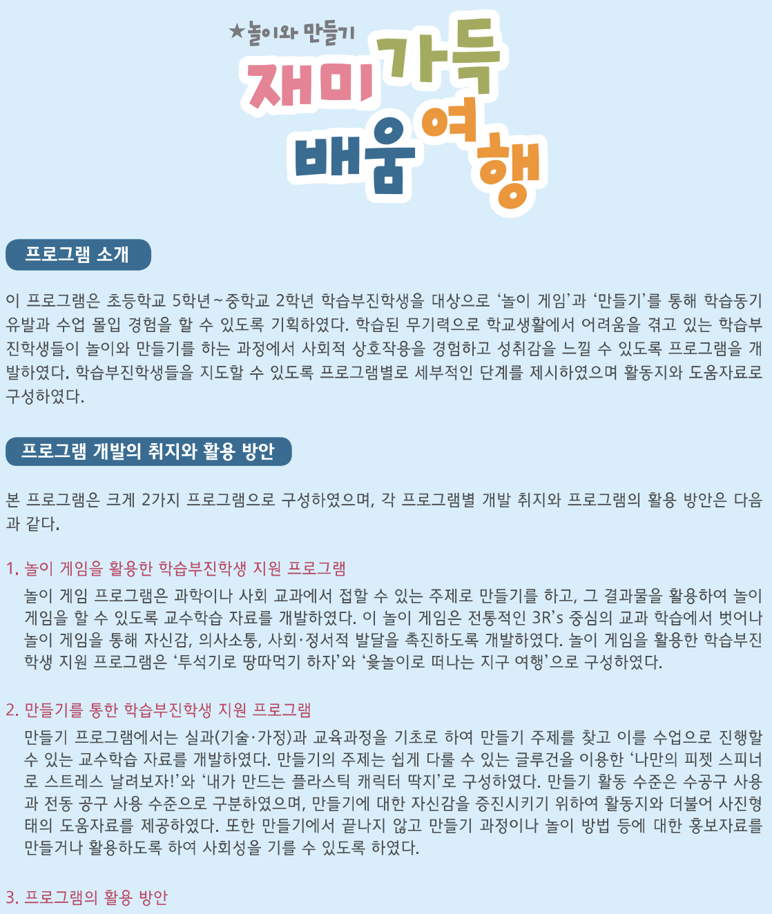 다양한 프로그램 중 학습지원이 필요한 학생을 대상으로 ‘놀이 게임’과 ‘만들기’를 통해 학습동기 유발과 수업 몰입 경험을 할 수 있도록 기획하여 제작한 ‘재미가득 배움여행’을 예시로 들어보겠습니다. 놀이 게임 프로그램은 사회, 과학, 실과(기술·가정) 교과에서 접할 수 있는 주제를 통해 만들기를 하고, 그 결과물을 활용하여 놀이 게임을 하는 과정을 통해 자신감, 의사소통, 사회·정서적 발달을 촉진하도록 합니다. 프로그램마다 개발 취지와 활용 방안이 다양하게 구성되어 있어 학생의 특성, 흥미를 가지고 있는 주제와 관련된 자료를 활용하면 효과적인 학생 지도가 이루어질 수 있습니다.