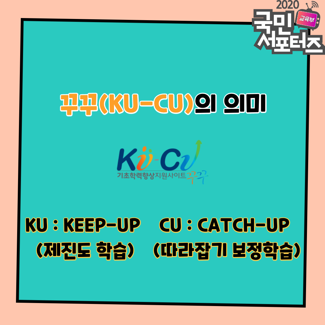 ‘꾸꾸(KU-CU)’의 의미는 다음과 같습니다. KEEP-UP, CATCH-UP의 머릿자를 따 만든 사이트 닉네임으로서 교과학습에 어려움이 발생하지 않도록 하기 위해서는 정규 수업에서 학생들이 뒤처지지 않게 하는 ‘제진도 학습(KEEP-UP)’이 잘 이루어져야 하며, 그럼에도 불구하고 학습에 어려움이 발생하는 학생들이 있으면 ‘따라잡기 보정학습(CATCH-UP)’이 잘 이루어져야 한다는 의미입니다.