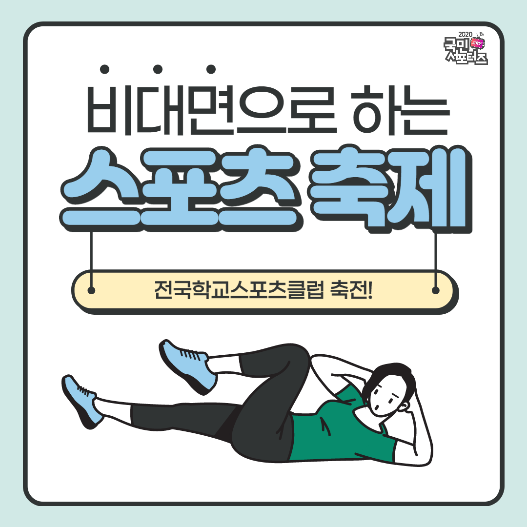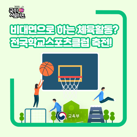 교육부에서는 이런 학생들의 스포츠 활동을 응원하고자 지난 11월 16일부터 12월 19일까지 ‘비대면 전국학교스포츠클럽 축전’을 진행 중입니다. 비대면 전국학교스포츠클럽 축전이란 학생들이 온라인으로 참여하는 스포츠 축제라고 볼 수 있습니다. 온라인으로 스포츠 축제를? 글로만 봐서는 어떤 식으로 진행되는지 감이 잘 오지 않는데요. 지금부터 학생들이 비대면으로 어떻게 스포츠를 즐기고 있는지, 전국학교스포츠클럽 축전을 통해 살펴보도록 하겠습니다!
