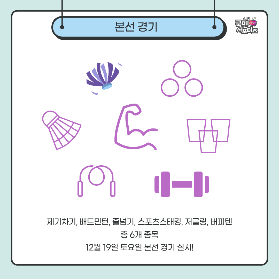 15개 종목 중 제기차기, 배드민턴, 줄넘기, 스포츠스태킹, 저글링, 버피텐, 총 6개 종목은 예선 결과에 따라 12월 19일 토요일에 본선 경기를 시행합니다. 본선 경기는 교육부 유튜브 채널에서 중계가 된다고 하니 출전하는 학생들을 응원하려고 한다면 꼭! 시청해야겠죠?