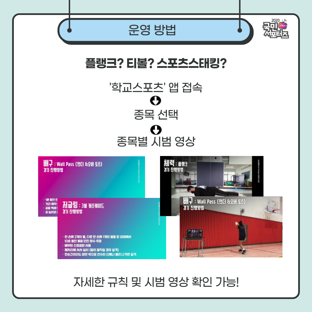 종목도 15종목으로 아주 다양합니다. 농구, 제기차기, 배구, 배드민턴, 스포츠스태킹, 육상, 저글링, 줄넘기, 매달리기, 버피텐, 턱걸이, 플랭크, 축구, 티볼, 치어리딩 등의 종목이 있습니다. 흔히 팀 스포츠로 알려진 농구, 배구, 배드민턴 등의 종목은 벽의 반동을 이용하거나 특정 동작을 체크하는 방식으로 진행하여 학생들이 보다 쉽게 스포츠 활동을 할 수 있도록 하였습니다.