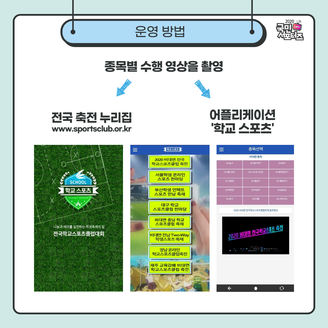 학생들은 종목별 경기 요강에 따라 종목별 수행 영상을 촬영하여 ‘비대면 전국 축전 누리집(www.sportsclub.or.kr) 또는 ‘학교 스포츠’ 앱을 통해 제출합니다. 자신의 자세와 운동 횟수, 시간 등을 영상에 같이 담음으로써 공정성을 높였습니다. 영상을 도중에 자르거나, 시간이 맞지 않으면 안 되기 때문에 학생들은 더 나은 영상을 찍기 위해 많은 노력을 하고 있습니다.