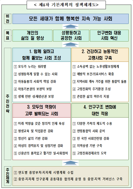 「제4차 기본계획」은 개인을 노동력‧생산력의 관점에 바라보는 「국가 발전 전략」에서 개인의 「삶의 질 제고 전략」으로 기본관점을 전환하였다. 핵심정책에 대한 과감한 투자를 통해 미래를 준비하는 청년층과 아이를 키우는 부모의 정책체감도를 획기적으로 제고하는 한편, 저출산이 ‘사회․경제․구조적 요인과 가치관 변화의 총체적 결과’임을 인식하고 거시적 접근을 병행하고자 하였다.