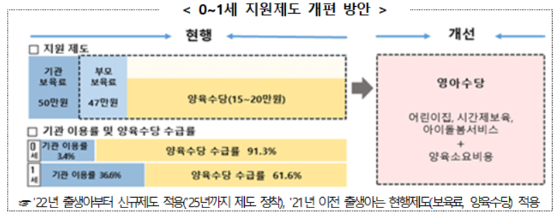 ▪ (영아수당 신설) ‘22년도 출생아부터 매월 영아수당 지원, 돌봄서비스 또는 직접육아 비용으로 사용. 부모의 선택권 보장 강화(’22년 도입, ’25년 월 50만원 목표로 단계적 인상)
