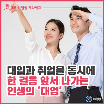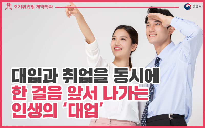 대입과 취업을 동시에 해결하고 학비까지 지원받는 ‘조기취업형 계약학과’를 통해 한 걸음 앞서 ‘대업’을 이루고 싶다면, 지금 바로 ‘조기취업형 계약학과 종합 포털’에서 자세한 내용을 만나보세요!