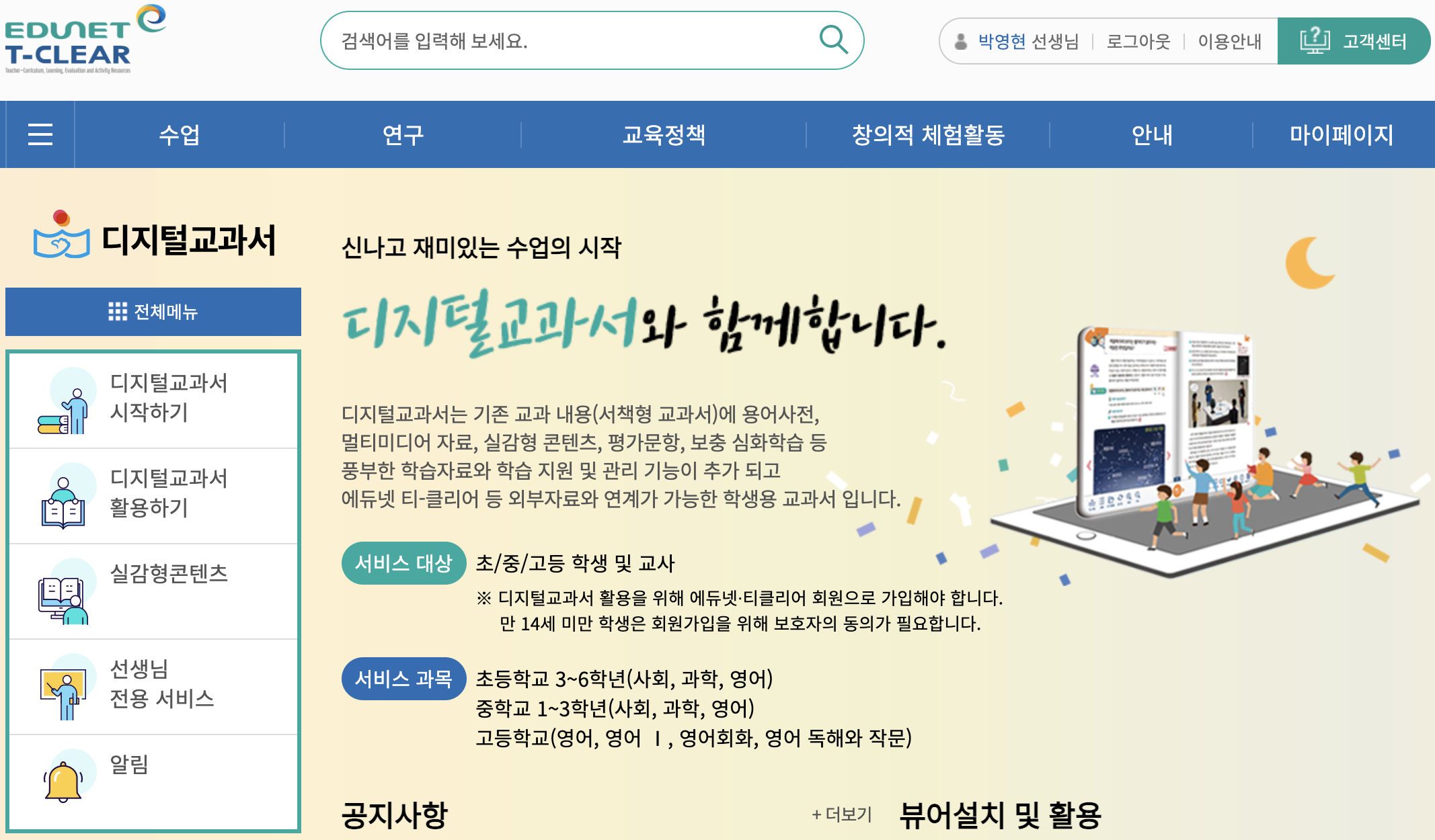 디지털교과서 서비스 과목은 초등학교부터 중학교까지 사회, 과학, 영어를 제공하며 고등학교는 영어를 분야별로 제공하고 있습니다. 이외 국어, 수학 등 특수과목 포함 전 교과는 PDF파일로 만나볼 수 있습니다. 다음으로 디지털교과서 홈페이지 구성에 대해 알아봅시다. 에듀넷·티-클리어 홈페이지 수업 탭에서 디지털교과서로 접속하면 됩니다.