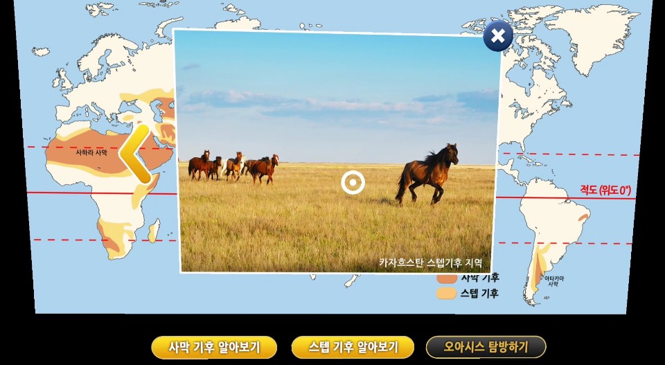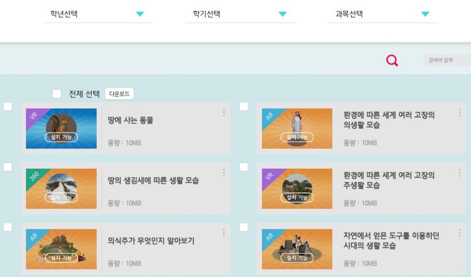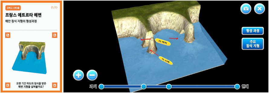 VR 콘텐츠의 경우 태블릿 PC, 스마트폰으로 3D 체험을 할 수 있으며 VR HMD(카드보드 등)로도 체험할 수 있도록 구성되어 있습니다. AR 콘텐츠의 경우 디지털 교과서 속 AR 마커를 카메라 인식을 통해 체험할 수 있습니다. 실감형 콘텐츠라는 이름에 걸맞게 학생들이 디지털 기기를 조작하며 교과 내용을 학습하는 부분에 있어 흥미도를 높일 수 있게 구성되어 있습니다. 실제로 학교 현장에서 활용한 결과 학생들이 매우 흥미롭게 학습에 참여하는 모습을 볼 수 있습니다. 다음으로 360°콘텐츠 유형에 대해 체험해보겠습니다.