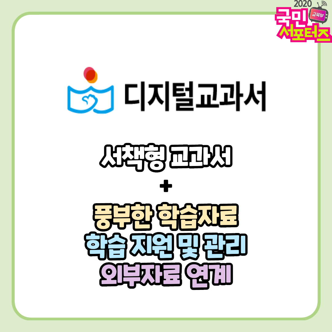 이렇게 디지털교과서에 대해 알아보았습니다. 기존 서책형 교과서에서 접하기 힘든 다양한 자료를 만나볼 수 있었습니다. 다양한 학습자료를 보다 재미있고 편리하게 접할 수 있는 디지털교과서에 국민 여러분의 많은 관심 바랍니다.