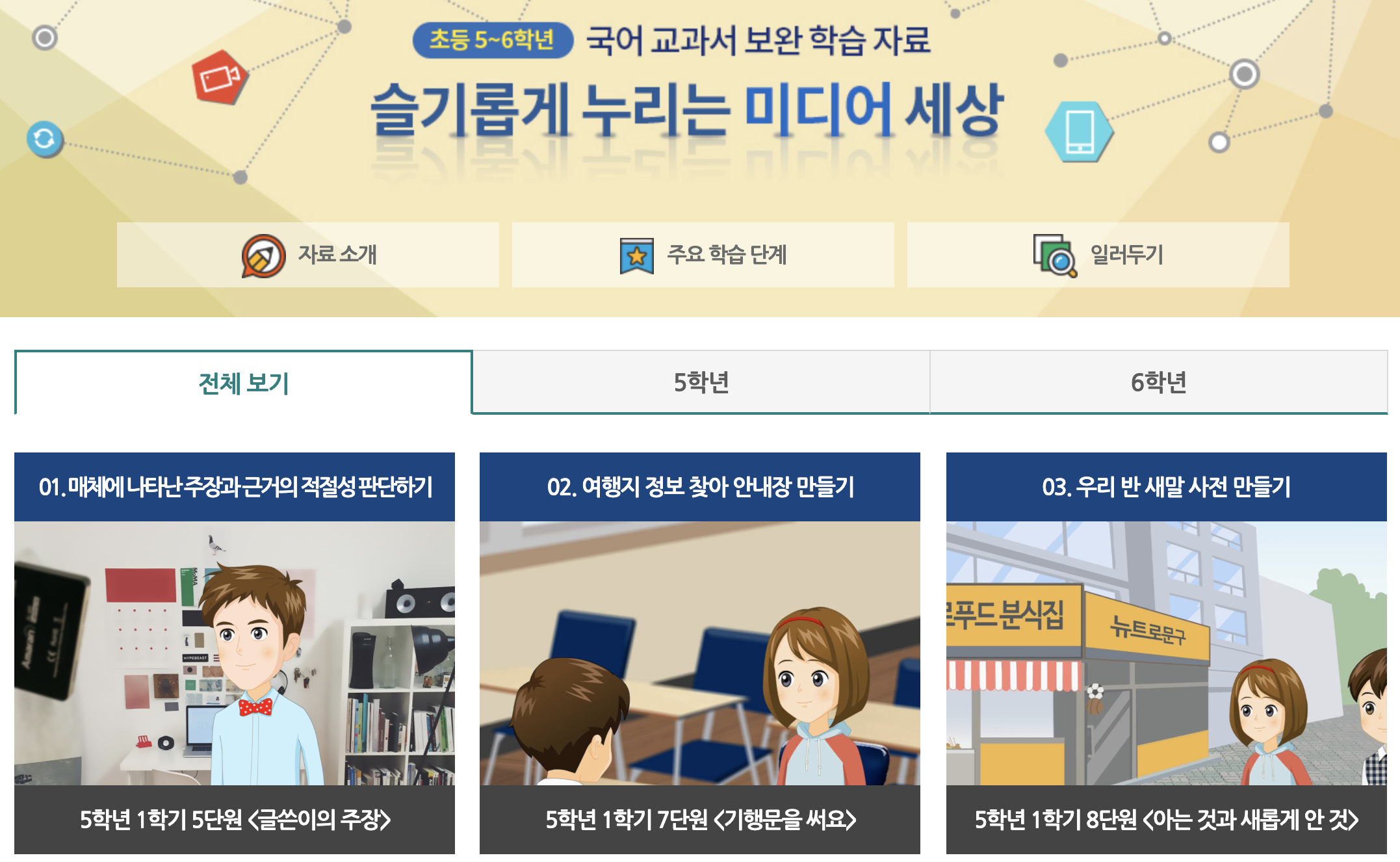 미디어는 ‘생각이나 감정, 정보를 주고받을 수 있게 하는 기기나 내용물’을 의미하며 리터러시는 ‘언어 자료를 읽고 지식이나 정보를 획득하거나 이해하며 개인의 생각이나 느낌을 언어 자료로 표현하고 공유할 수 있는 능력’을 의미합니다. 즉, 미디어 리터러시는 다양한 매체의 자료를 분석·평가하고, 이를 이용하면서 정보를 생산하고 공유하는 것을 말합니다. 문제 확인, 알아보기, 실천하기 학습 단계를 통해 성취기준 도달 및 역량을 제고하는데 도움을 줍니다.