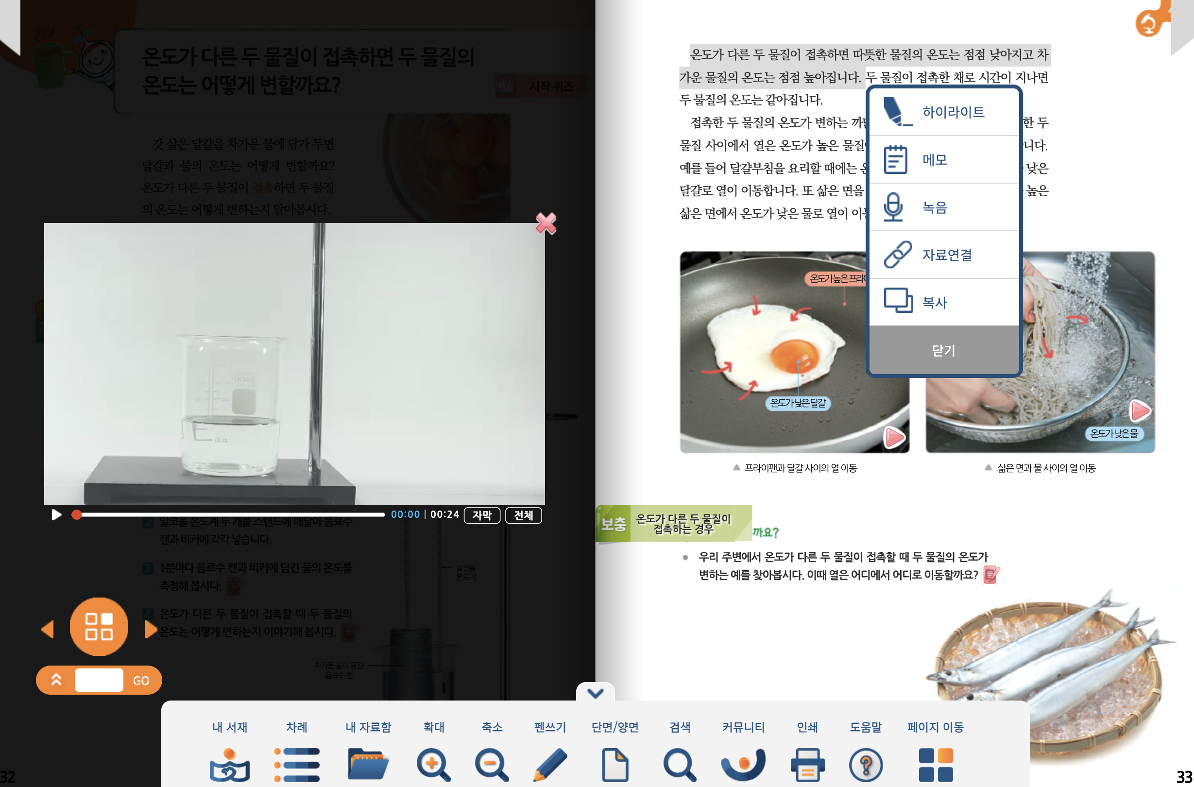 서책형 교과서 화면에 다양한 콘텐츠가 더해진 모습입니다. 과학 실험의 경우 영상 자료를 통해 실험 과정을 전반적으로 이해하는데 더욱 도움이 될 것 같습니다. 이외에도 보충 자료 콘텐츠로 실생활에서 쓰이는 다양한 예시에 대해 알게 되어, 학생들로 하여금 학습에 대해 흥미를 이끌 수 있습니다. 학습자가 중요한 부분에 대해서 강조하고 싶을 때는 해당 내용을 드래그하여 하이라이트, 메모 등을 할 수 있는 기능도 사용할 수 있습니다. 이처럼 디지털교과서 속 다양한 콘텐츠는 교과 내용 학습에 많은 도움을 줍니다. 과학 이외 사회, 영어와 같은 교과서에도 해당 교과 내용 특색에 맞추어 다양한 자료를 제시하고 있습니다. 국어 교과의 경우 ‘미디어 리터러시’ 자료를 통해 학습을 보완할 수 있습니다.