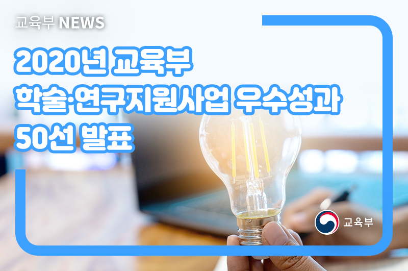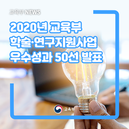 교육부(부총리 겸 교육부장관 유은혜)는 「교육부 학술‧연구지원사업 우수성과 50선」을 선정하고, 시상식을 한국연구재단 대전청사에서 12월 17일(목) 14시에 개최한다.