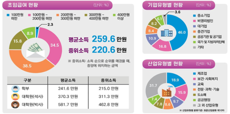 2019년 졸업자(2018.8월 졸업자 포함) 중, 상세 정보 확인이 가능한 건강보험 직장가입자의 월 평균소득, 취업 준비기간, 기업·산업유형별 취업자 정보는 다음과 같다.