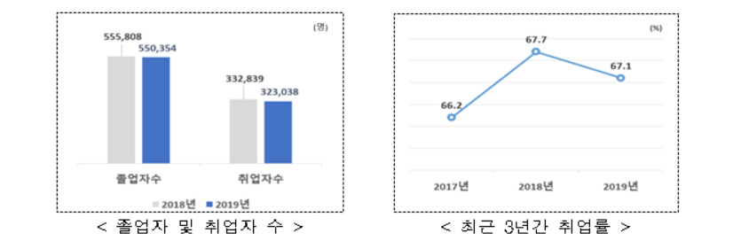 (전체 취업률) 2019년 고등교육기관 졸업자(‘18.8월 졸업자 포함) 중 전체 취업자는 32만 3,038명으로 취업대상자 48만 1,599명의 67.1% 수준이며 전년(67.7%, 2018.12.31일 기준) 대비 0.6%p 감소하였다.