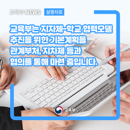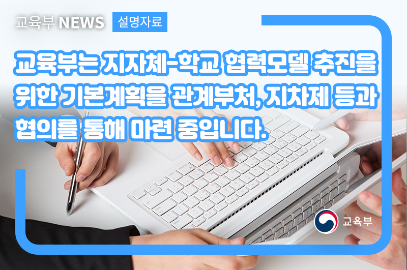 교육부는 지자체-학교 협력모델 추진을 위한 기본계획을 관계부처, 지차제 등과 협의를 통해 마련 중입니다.