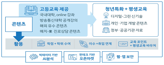 ○ 빅데이터 분석으로 최적 학습경로를 제공하고, 이수결과를 청년들이 학점·학위취득, 취업·고용 등에 활용하도록 맞춤형 콘텐츠를 지원할 예정임