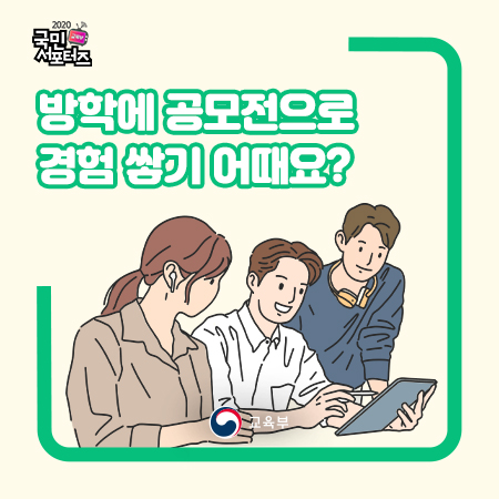 이번 방학에 뜻깊은 경험을 하고 싶으신 분들, 처음 공모전을 준비해보는 분들에게 도움이 되었으면 좋겠습니다. 댓글로 여러분만의 공모전 참여 팁이 있다면 남겨주시고, 서로 소통하면 어떨까요? 지금까지 교육부 국민 서포터즈였습니다!