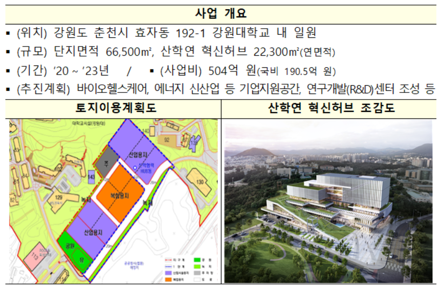 강원대 캠퍼스 혁신파크는 대학 내 66,500㎡ 면적의 부지를 대학과 한국토지주택공사가 공동사업시행자로 참여하여 도시첨단산업단지로 조성하며, 도시첨단산업단지 지정으로 기존 자연녹지지역(용적률 100%)을 모두 준공업지역(용적률 400%)으로 변경하여 최대 4배의 고밀도로 활용할 수 있게 된다.