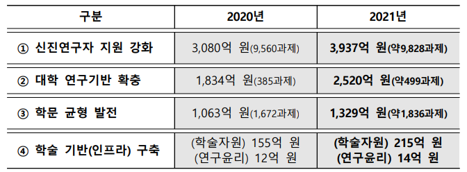 학술 발전의 미래를 담당할 학문후속세대의 안정적 연구몰입 환경을 조성하고, 창의적이고 새로운 연구에 적극적으로 도전할 수 있도록 신진 연구자들에게 3,937억 원의 연구비를 지원한다.