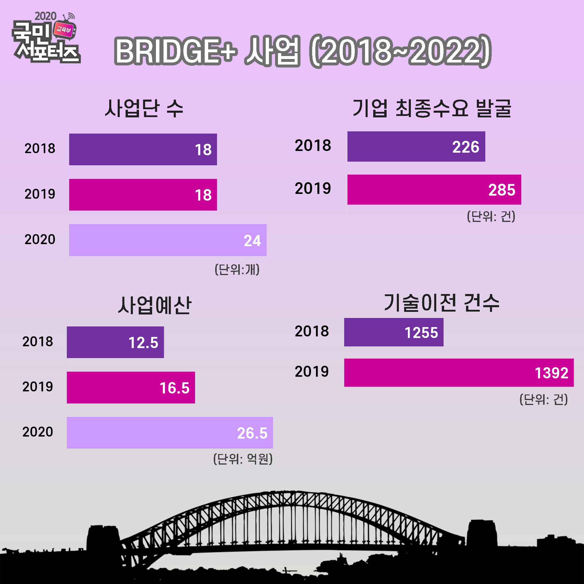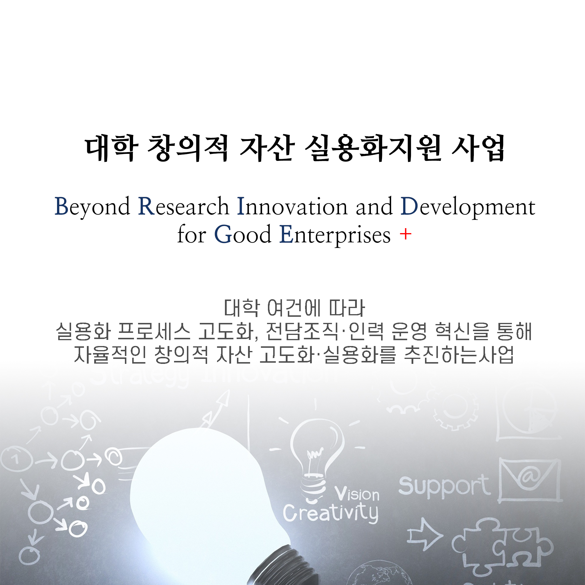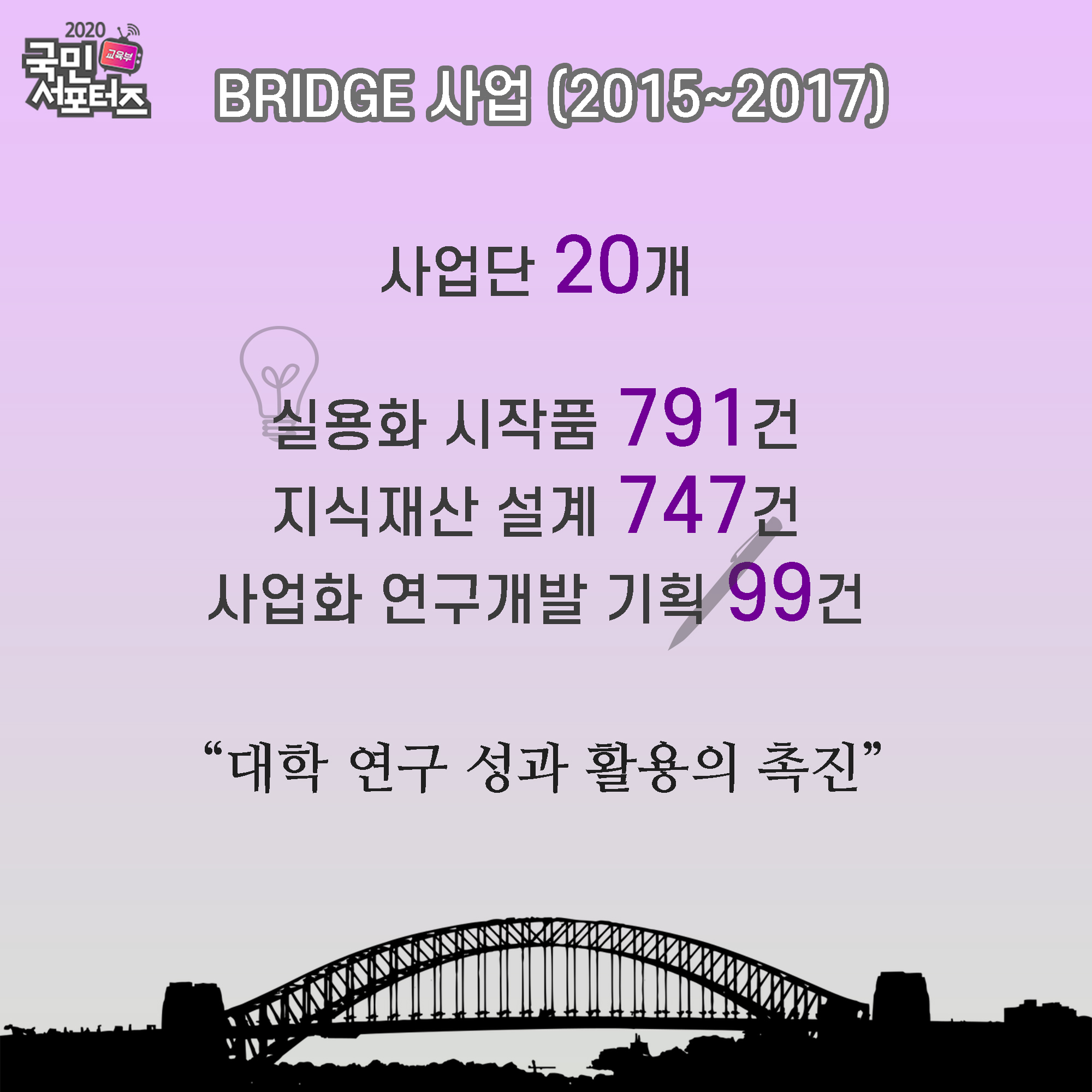 BRIDGE 사업의 BRIDGE는 Beyond Research Innovation and Development for Good Enterprises의 약자로 대학이 연구 결과 창출에 머무는 것이 아니라 연구와 개발을 통해 얻어낸 지적재산의 실용화를 목표로 한다는 뜻을 담고 있습니다. BRIDGE 사업은 2017년에 종료된 후 2018년부터 BRIDGE+ 사업으로 더 발전되어 추진되고 있습니다.