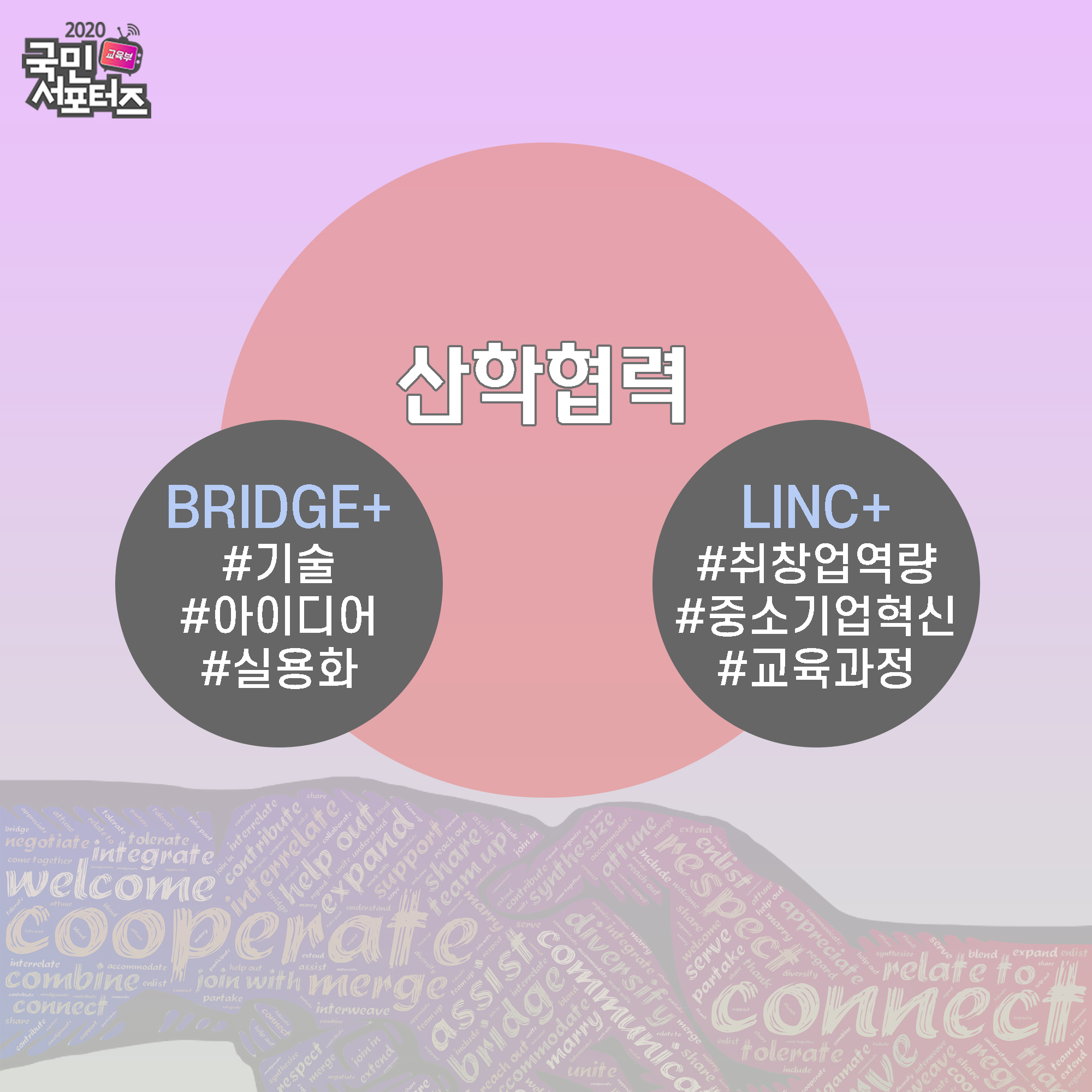 LINC+는 Leaders in INdustry-university Cooperation+의 약자로 산학협력의 자율성의 확대 및 내재화, 다양화 및 지속가능성 제고를 위해 노력하고, 기업과 학교가 함께 교육과정을 운영하는 등 사회맞춤형교육을 제공함으로써 취·창업 역량을 강화해 국가경쟁력을 강화하는 사업입니다. 즉, BRIDGE와 BRIDGE+에서는 기술과 아이디어가 중점이 되어 사업화 및 실용화를 목표로 한다면, LINC+에서는 중소기업에 대한 혁신을 지원하고 실무에 적합한 지식과 역량을 겸비한 인재를 기르는 데에 초점을 두고 있어 산업계와 학계가 협력한다는 데에서는 같은 목표를 가지고 있지만 조금씩 다른 방식으로 협력하고 있다는 차이점이 있습니다.