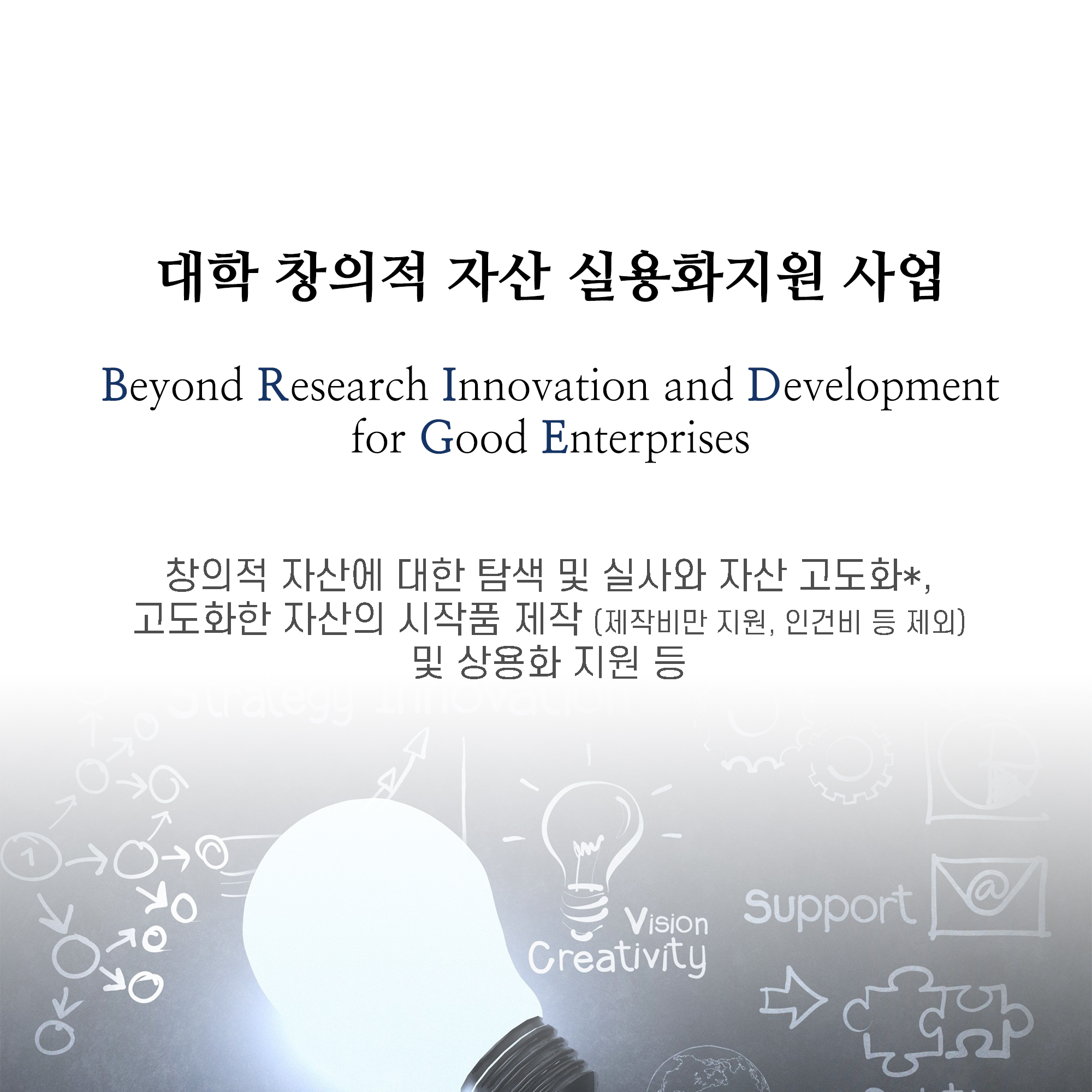대학 창의적 자산 실용화 지원 사업(이하 ‘BRIDGE 사업’)은 2015년부터 실시되어 창의적 자산이 적절히 보호되도록 지식재산의 완성도를 높이는 작업인 창의적 자산에 대한 탐색 및 실사와 자산 고도화에 대해 지원하고, 실제로 시작품을 제작하고 상용화하는 데에 지원하는 등 대학이 보유한 창의적 자산의 실용화를 지원하는 사업입니다. BRIDGE 사업은 대학에서 충분히 사업화 잠재력이 있는 성과가 있더라도 관련된 분야와 협동을 하기 어렵거나 사업화를 위한 자금이 부족해서 제대로 그 성과를 활용하지 못하는 현실을 개선하고자 추진되었습니다.