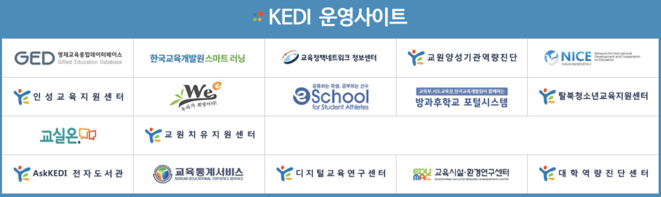 한국교육개발원(KEDI)는 우리나라 교육의 산증인이라고 할 정도로 1972년 설립 이후 지금까지 한국 교육의 싱크탱크 역할을 수행해 왔습니다. 교육에 대한 국가적 책임을 다하고, 공유 성장을 통해 미래 교육을 선도하는 교육정책 연구의 핵심 기관이 되도록 차별적 연구 역량을 강화하고자 합니다.
