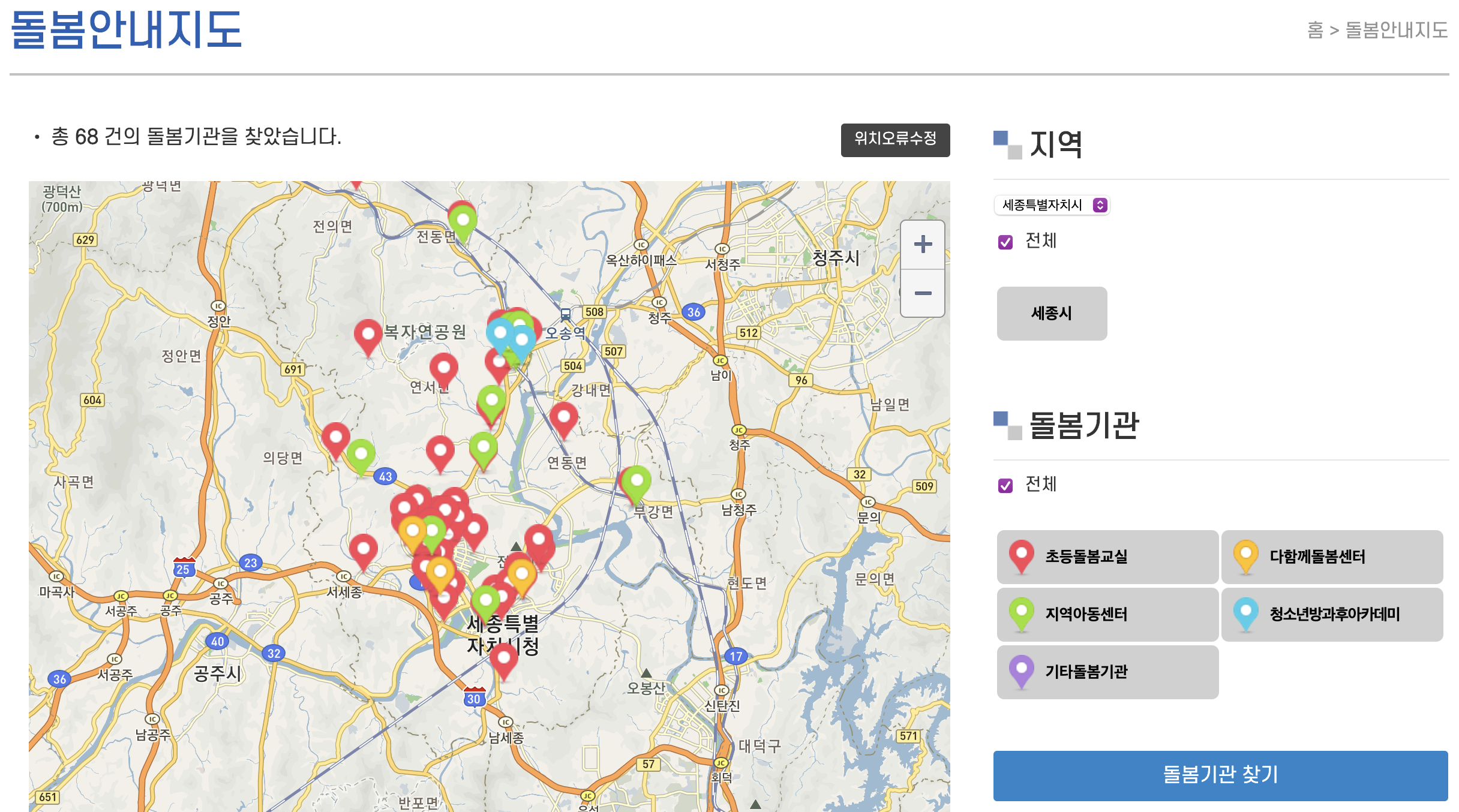 2019년 4월 기준 방과후학교 운영 학교는 11,688학교로 98.6% 운영되고 있으며, 초등돌봄교실 운영 학교는 6,117학교로 99.2% 운영되고 있습니다. 대부분의 학교에서 운영되고 있음을 알 수 있습니다. 돌봄안내지도에서 초등돌봄교실, 다함께돌봄센터, 지역아동센터, 청소년방과후아카데미, 기타돌봄기관을 분류로 어디에 위치하는지에 대한 정보를 쉽게 알 수 있습니다.