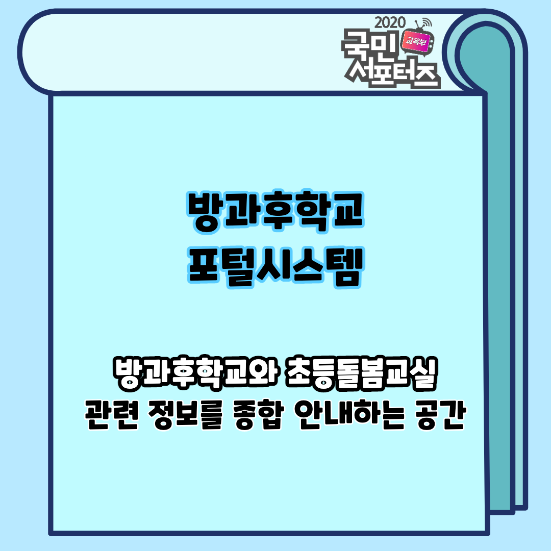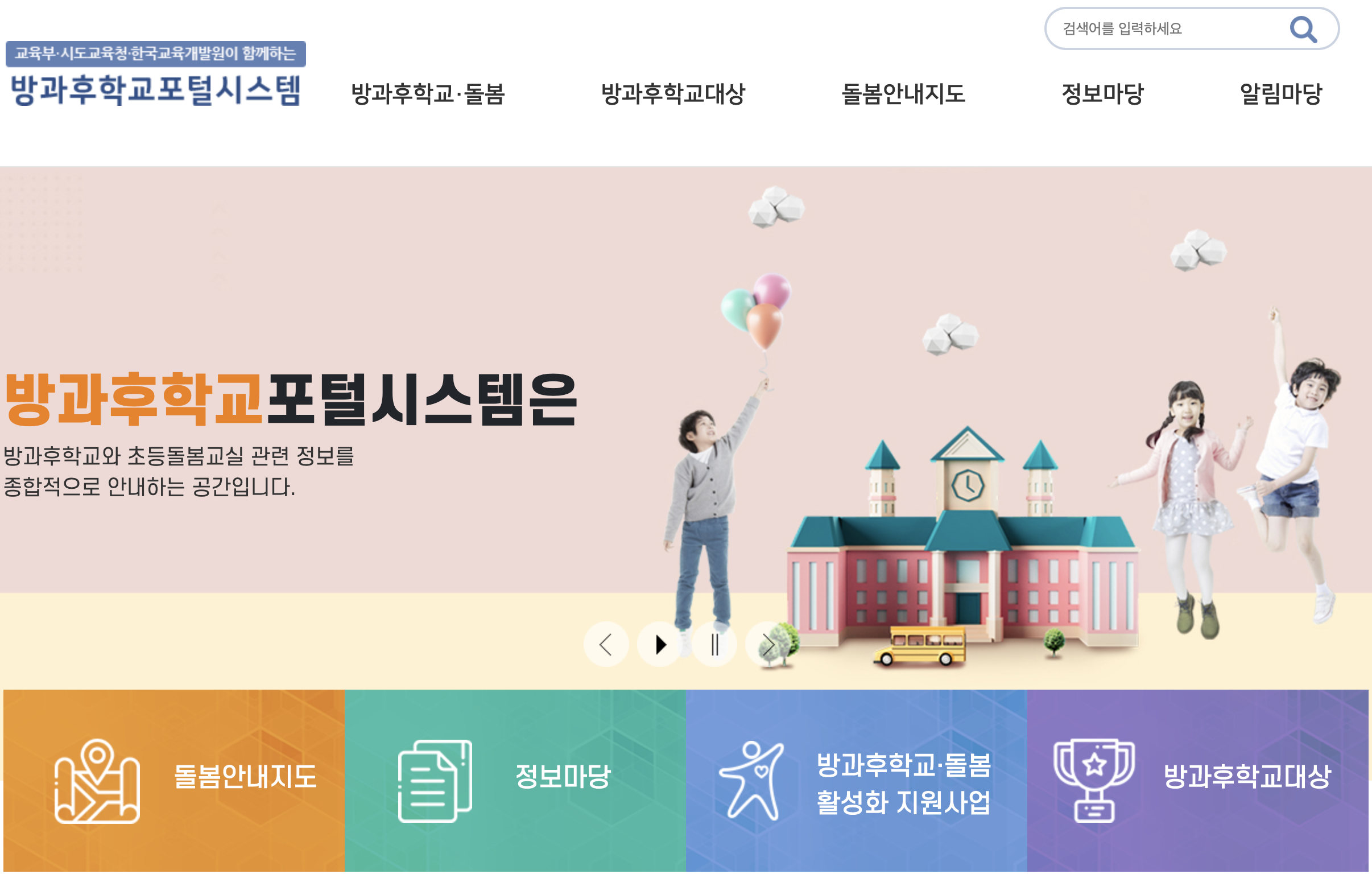 다음으로 방과후학교 포털시스템에 대해 알아보겠습니다. 교육부, 한국교육개발원, 시·도교육청이 함께하는 방과후학교 포털시스템은 방과후학교와 초등돌봄교실 관련 정보를 종합적으로 안내하는 공간입니다. 방과후학교는 지역사회와 연계한 다양하고 창의적인 교육 경험을 제공하여 창의융합형 인재를 육성합니다. 초등돌봄교실은 지역사회와 연계한 온종일 돌봄 생태계를 구축하여 촘촘한 돌봄서비스를 제공합니다.