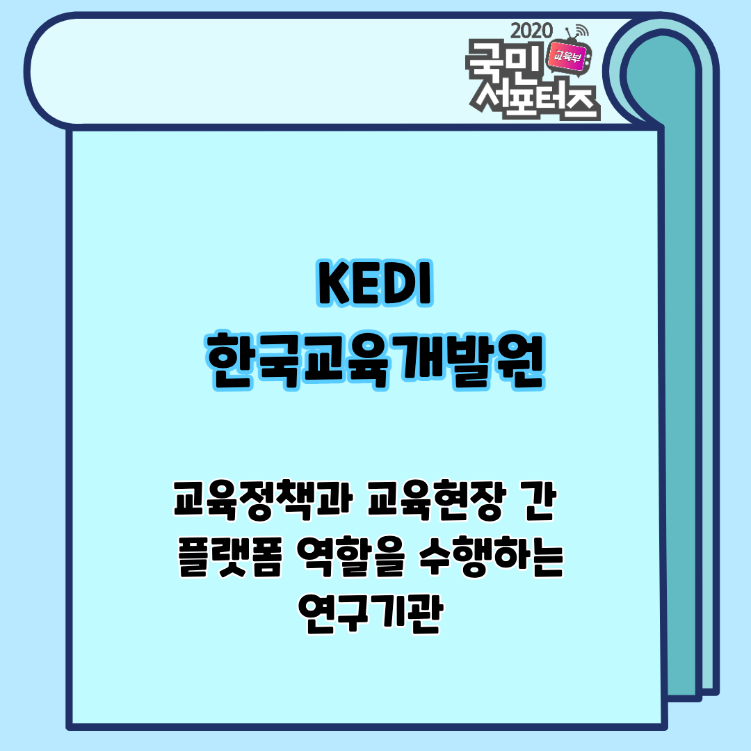 교육부에서 여러 가지 교육정책을 다루는 모습을 볼 수 있고, 교육 현장에 속하는 학교에서 정책이 어떻게 적용되고 있는지 살펴볼 수 있습니다. 한국교육개발원(KEDI)은 교육정책과 교육 현장 간 소통을 담당하고 있습니다. 또한 교육정책과 교육 현장 간 플랫폼 역할을 수행하며 제4차 산업혁명과 한반도 평화 시대를 대비한 연구 협력 확대를 통해 포용 사회를 위한 미래 교육을 선도해 나가고 있습니다.