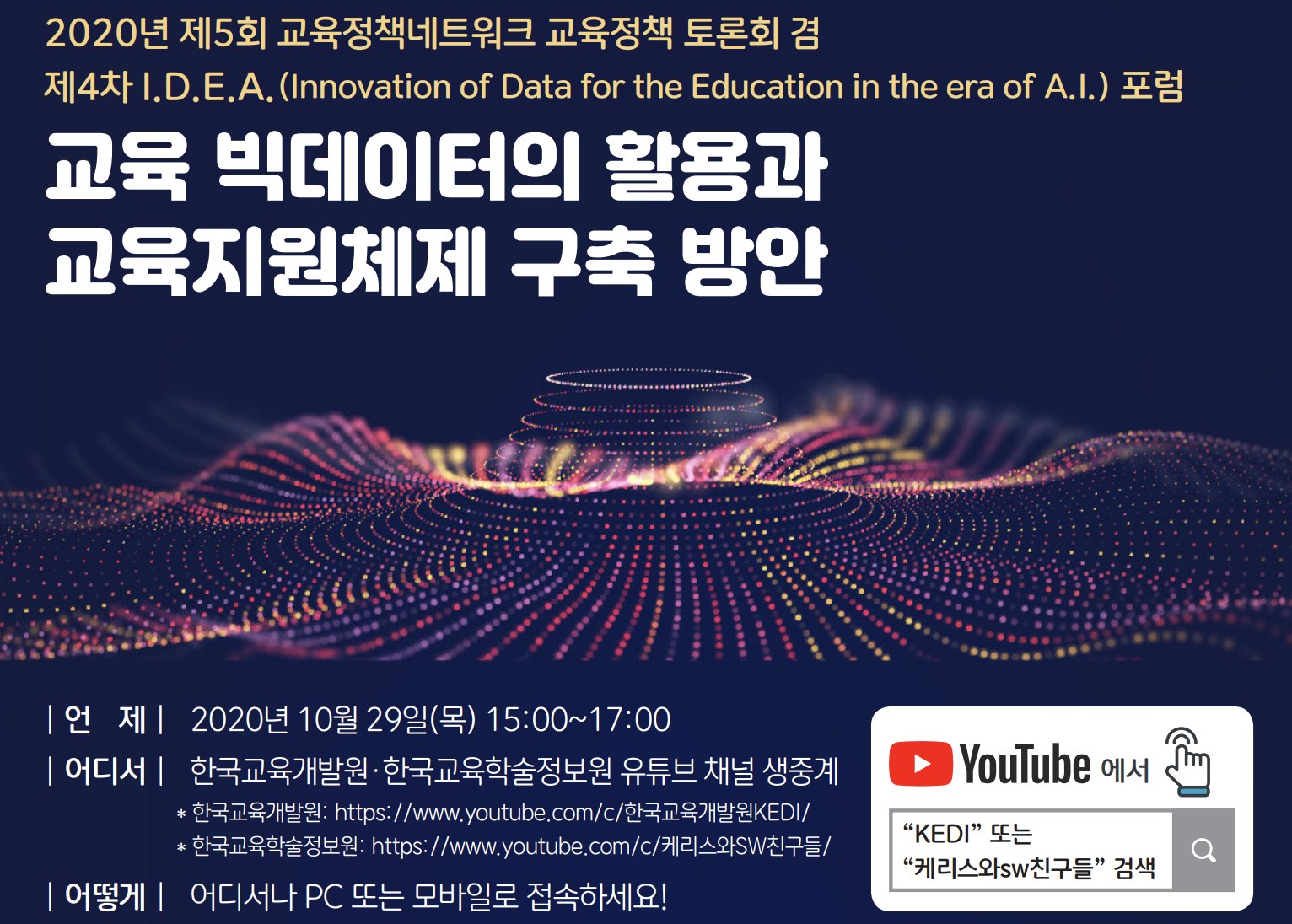 또한 한국교육개발원은 교육부 및 시·도교육청과 함께 주기적으로 교육정책에 대한 토론회를 개최하고 있습니다. 교육정책 토론회는 교육계 종사자와 일반 국민의 소통을 토대로 정책 숙의 과정에서 이해관계자의 참여와 현장성을 증진하는 교류의 장이 됩니다.