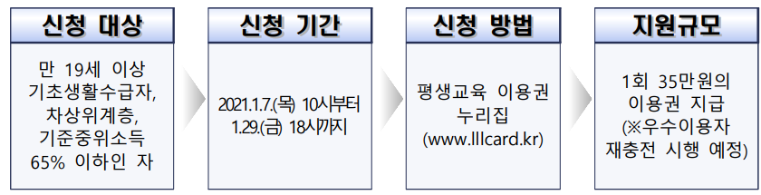 2021년 평생교육 이용권(바우처) 신청을 1월 7일(목)부터 29일(금)까지 누리집(www.평생교육바우처.kr 또는 www.lllcard.kr)을 통해 접수한다.