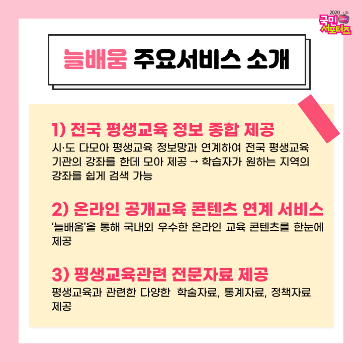 국가 평생 학습 포털 '늘배움'이란, 여기저기 흩어져 있는 양질의 교육 콘텐츠와 평생학습 정보를 쉽게 이용할 수 있도록 평생학습 서비스를 종합하여 제공하고, 누구나, 언제나, 어디서나 무료로 학습자 맞춤형 서비스를 이용할 수 있는 평생학습 종합포털입니다.
