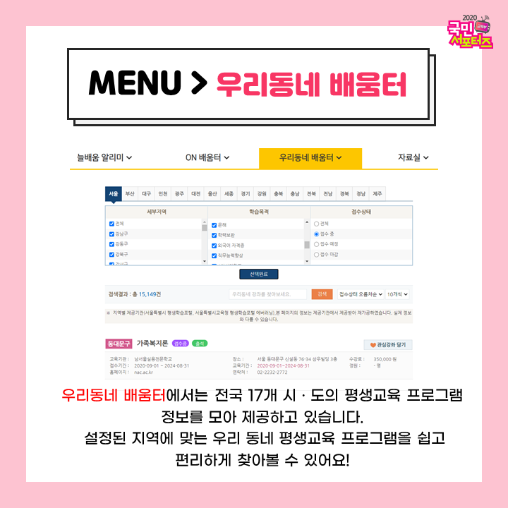 한편 메뉴에서 '우리동네 배움터'를 클릭하면, 위 창과 같이 선택한 지역에서 진행되는 오프라인 평생교육 강좌 목록을 확인하실 수 있답니다! 현재 전국 17개 시·도의 평생교육 프로그램 정보가 제공되고 있으며, 선택한 지역 내에서도 학습목적에 따라 구분된 여러 강좌 현황을 볼 수 있습니다.